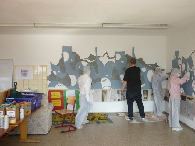 Nachdem sie ihm Kunstunterricht verschiedene Schriftarten durchgenommen hatten, beschlossen sie, das Gelernte in ihrem Klassenzimmer umzusetzen. Unter Anleitung des Profi-Sprayers Marcel Venemann sprühten sie mit viel Tatendrang den eigens ausgewählten Slogan „Young, Wild & Free“ in kräftigen Blautönen an ihre Klassenwände.
