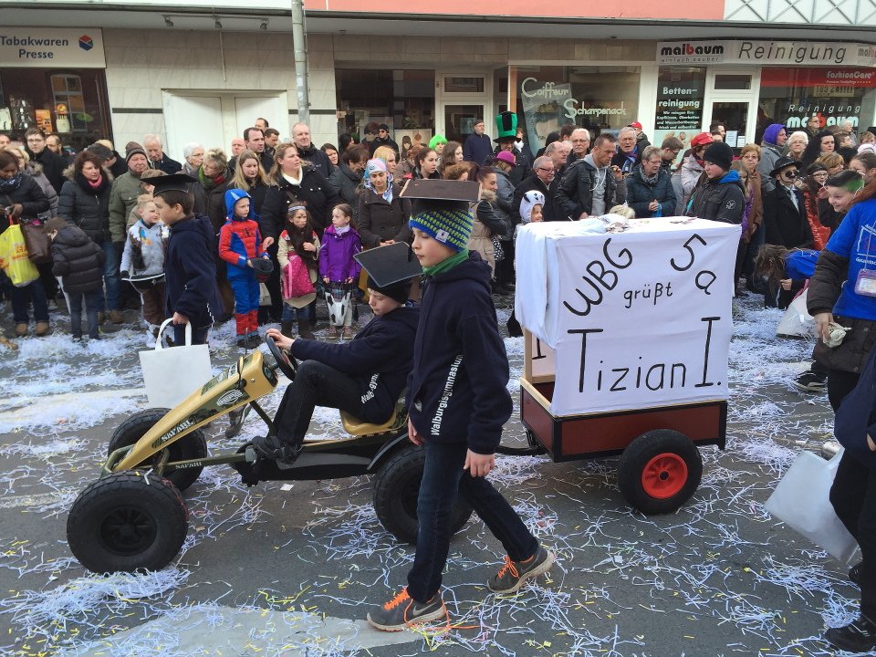 Während Tizian I. auf dem Prinzenwagen thronte, begleiteten ihn seine Mitschülerinnen und Mitschüler als Kinderprinzengarde mit Schulpullis und Doktorhüten. Das Highlight: Kamelle in die jubelnde Zuschauermenge werfen! Ein Junge hatte sogar extra einen Wagen gebastelt (Aufschrift: „WBG 5a grüßt Tizian I.“ und „Abi 2022“, s. Fotos), den er mit einem Kettcar zog und mit dem die Süßigkeiten transportiert wurden. Zwischendurch wurden die begeisterten Kinder von Radio MK interviewt. Einige Mädchen wollten am Ende unbedingt wissen, wie man denn Kinderkarnevalsprinzessin wird. Helau!