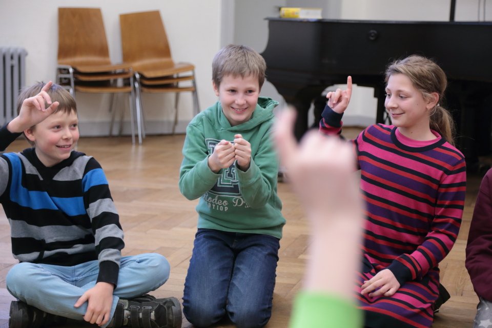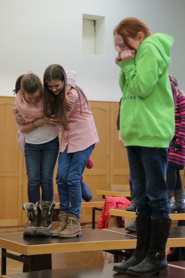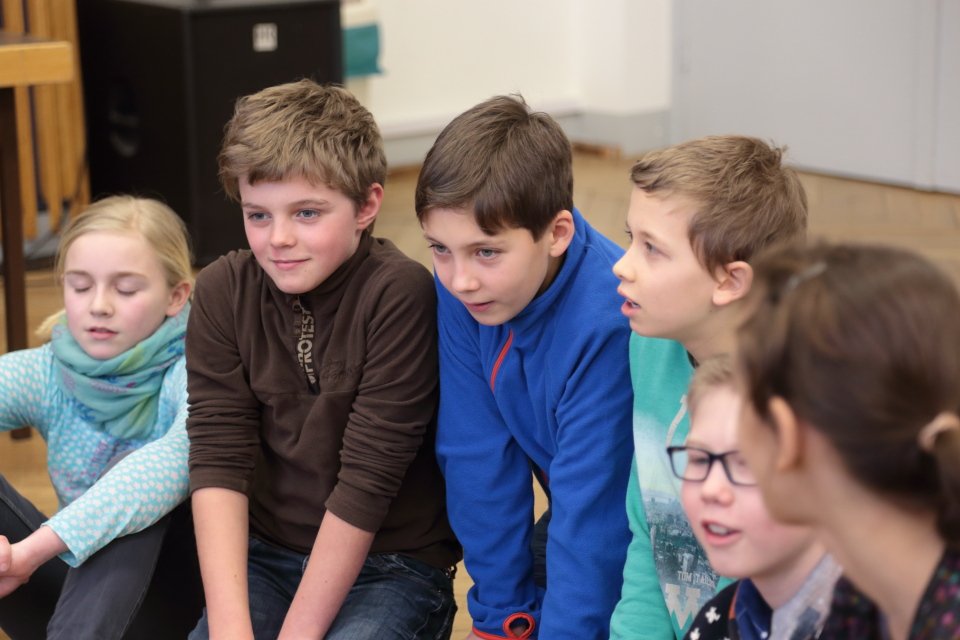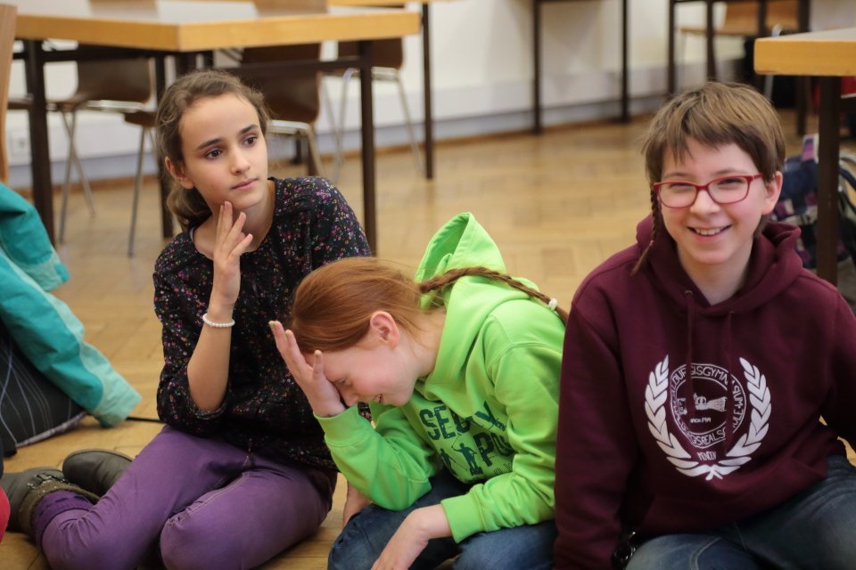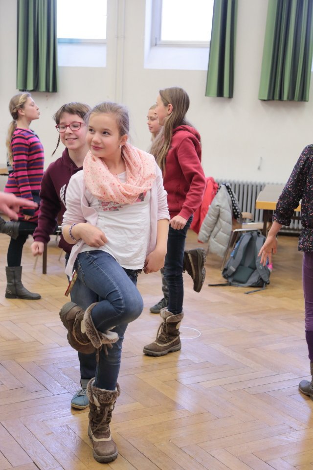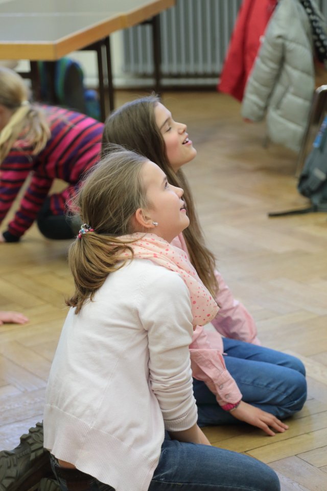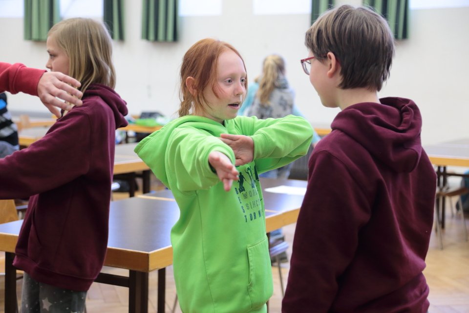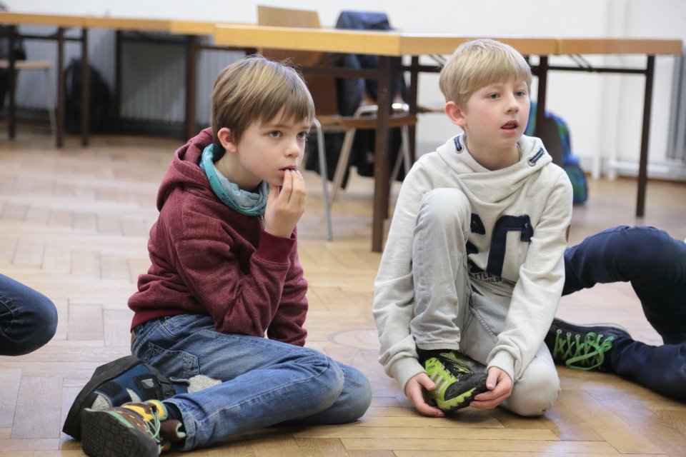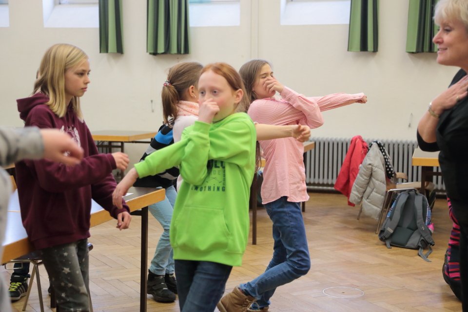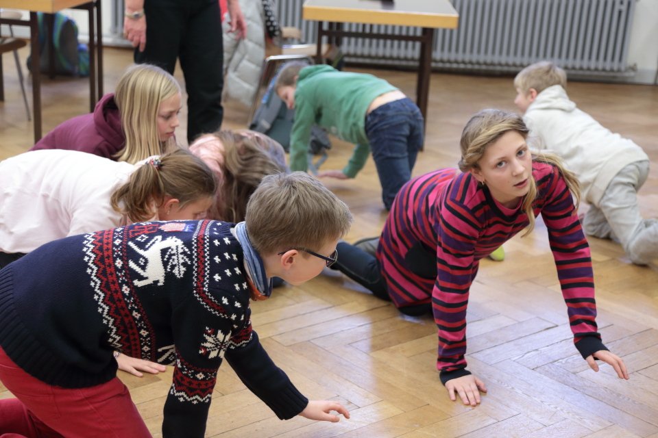 Zu Beginn geht es um szenisches Gestalten von Alltagssituationen, wobei pantomimisch Impulse umgesetzt werden. Spaß und Teamarbeit stehen dabei eindeutig im Vordergrund, wobei die Unterrichtssprache durchgängig Englisch ist. Gesten und Nachahmung helfen auch Unbekanntes zu verstehen.