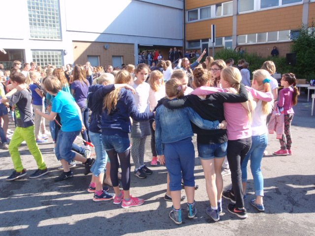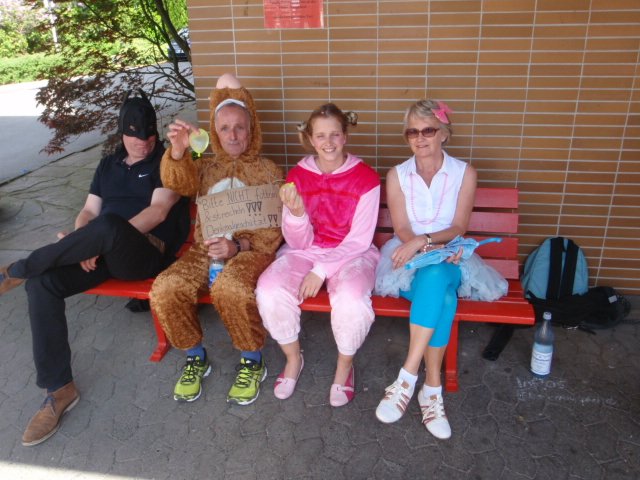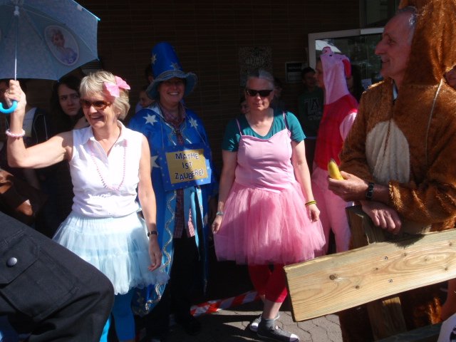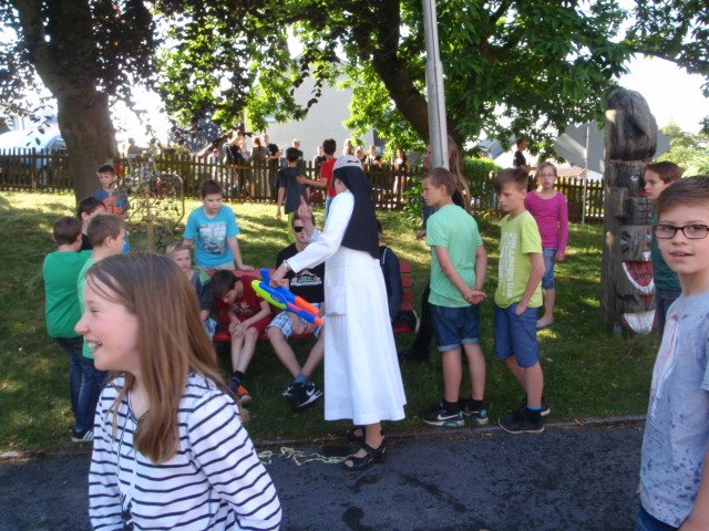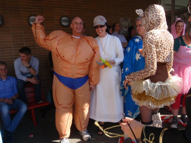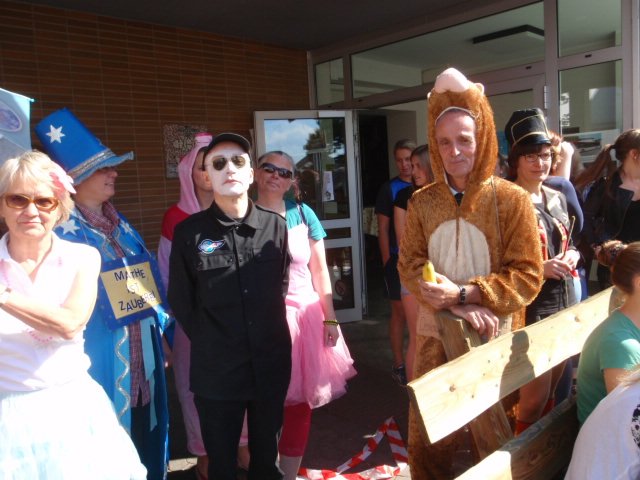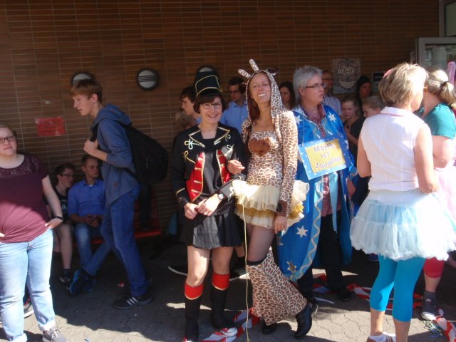 Unter diesem Motto verabschiedete sich die Abiturientia 2015 mit einem großen Fest von der Schulgemeinde. Der Lehrerparkplatz wurde wie jedes Jahr für Bühne und Publikum frei gehalten und an diesem Morgen waren die Abiturient/innen einmal die ersten auf dem Schulgelände. Ihre LK-Lehrer/innen brachten sie gleich mit, denn sie hatten sie zu Hause abgeholt und passend zum Zirkusmotto verkleidet. Clowns und wilde Tiere samt Dompteuse waren zusammen mit Muskelprotzen und zierlichen Tänzerinnen die Stars in der Manege und mussten lustige Aufgaben lösen. Zur Erfrischung der Schülerschaft hatten sich die Abiturient/innen mit Wasserpistolen aller Größen ausgestattet; die Rechnung hatten sie aber ohne Schwester Maria Thoma gemacht – diese hatte viel zu tun, die Waffen zu konfiszieren.