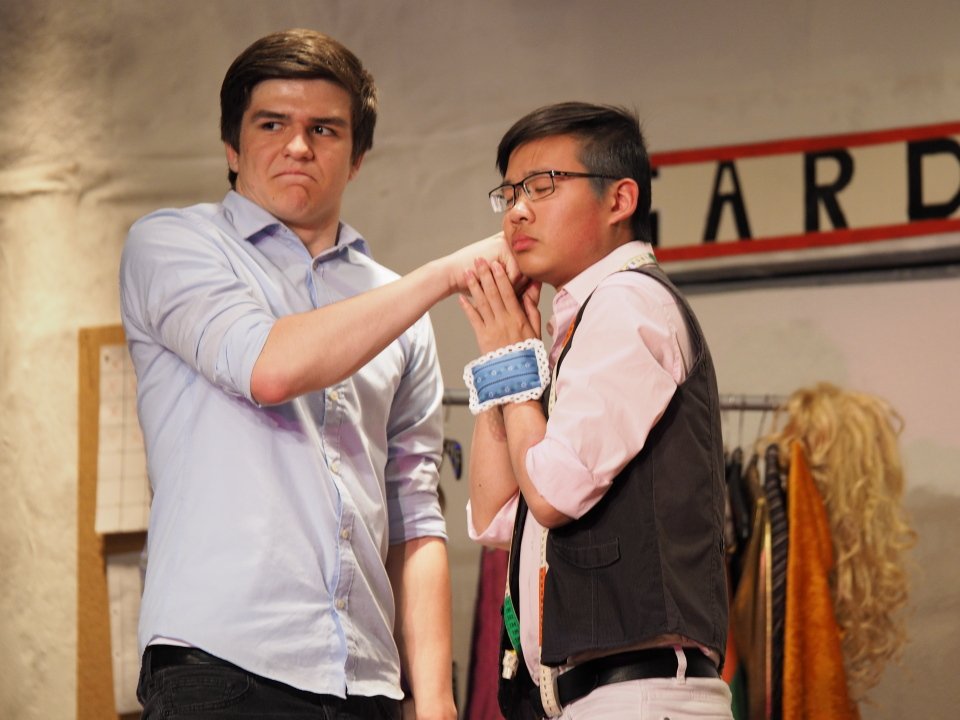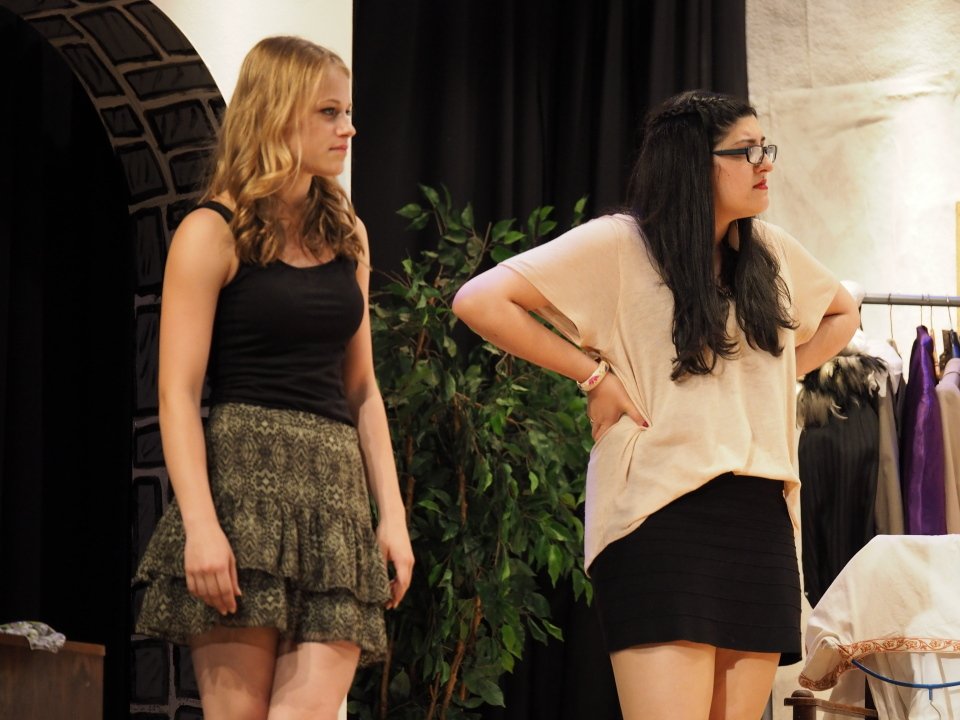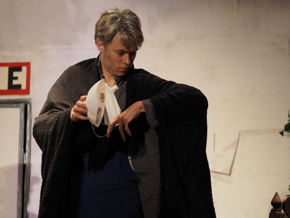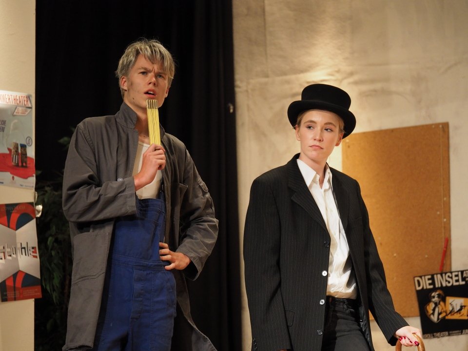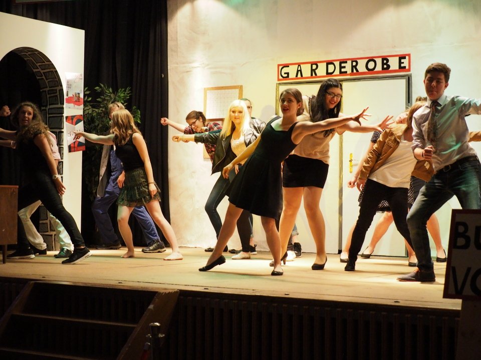 Am Sonntag um 17 Uhr haben alle Interessenten, die heute verhindert waren, noch einmal die Gelegenheit, unsere Schülerinnen und Schüler der Jahrgangsstufe Q1 in dem abwechslungsreichen Stück zu erleben. Es lohnt sich! Als Appetitanreger mögen die folgenden Fotos der heutigen Aufführung dienen: