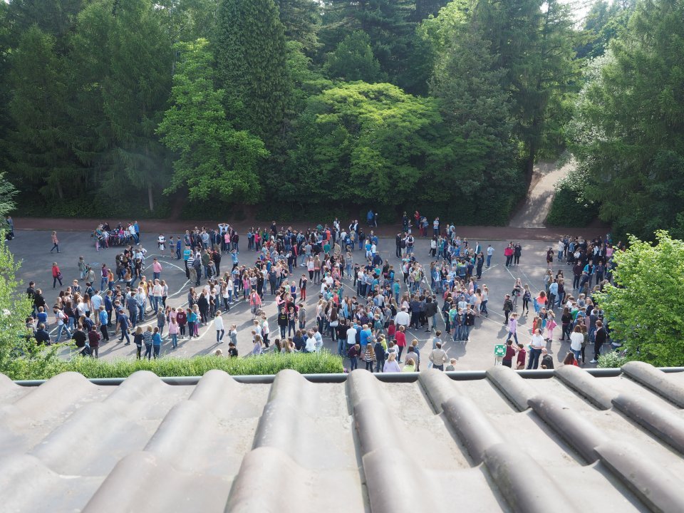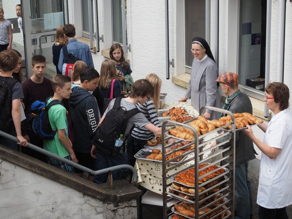 Nach dem traditionellen Schulgottesdienst in St. Walburgis gingen alle Schüler nicht in ihre Klassenräume, sondern direkt auf den Schulhof. Dort hatte die SV alles vorbereitet, damit die Schülerschaft sich zum Wort „DANKE“ aufstellen konnte. Erst dann wurde die ahnungslose Schwester Maria Thoma in den fünften Stock geführt, von wo sie einen perfekten Aus- und Abschiedsblick auf ihre Schülerinnen und Schüler hatte. Diese Überraschung ist der SV gelungen!