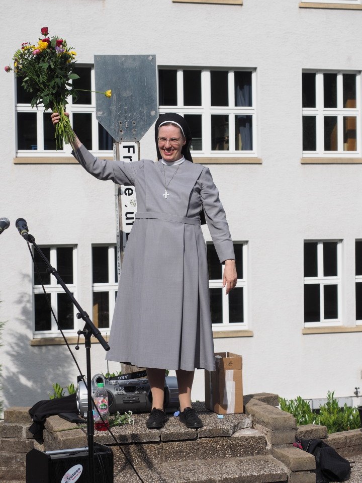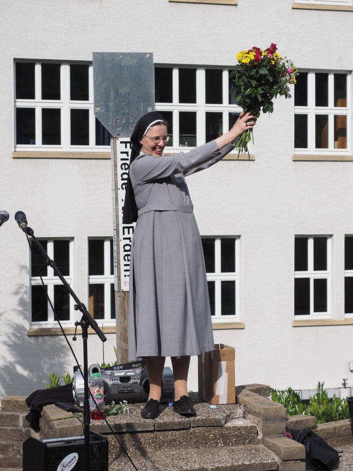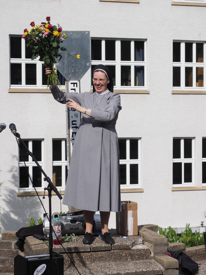 Schwester Maria Thoma ließ es sich nicht nehmen, sich auf dem Schulhof von allen Schülerinnen und Schülern persönlich zu verabschieden, während diese ihr im Kanon „Viel Glück und viel Segen auf all Deinen Wegen“ wünschten. (Weitere Fotos siehe unten).