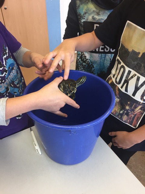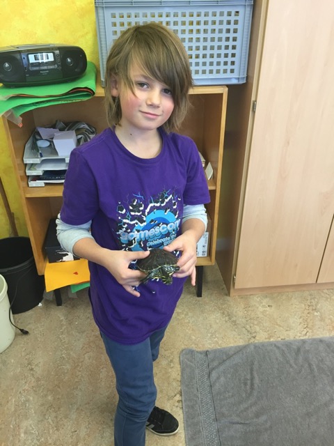 Am 20. November kam die Schildkröte Schieggi von Benjamin zu Besuch. Alle Kinder durften sie streicheln und Fotos von ihr machen. Schieggi durfte durch den Klassenraum „düsen“. Von ihrem Ausflug müde geworden wurde Schieggi wieder in ihren Eimer zurückgesetzt.
