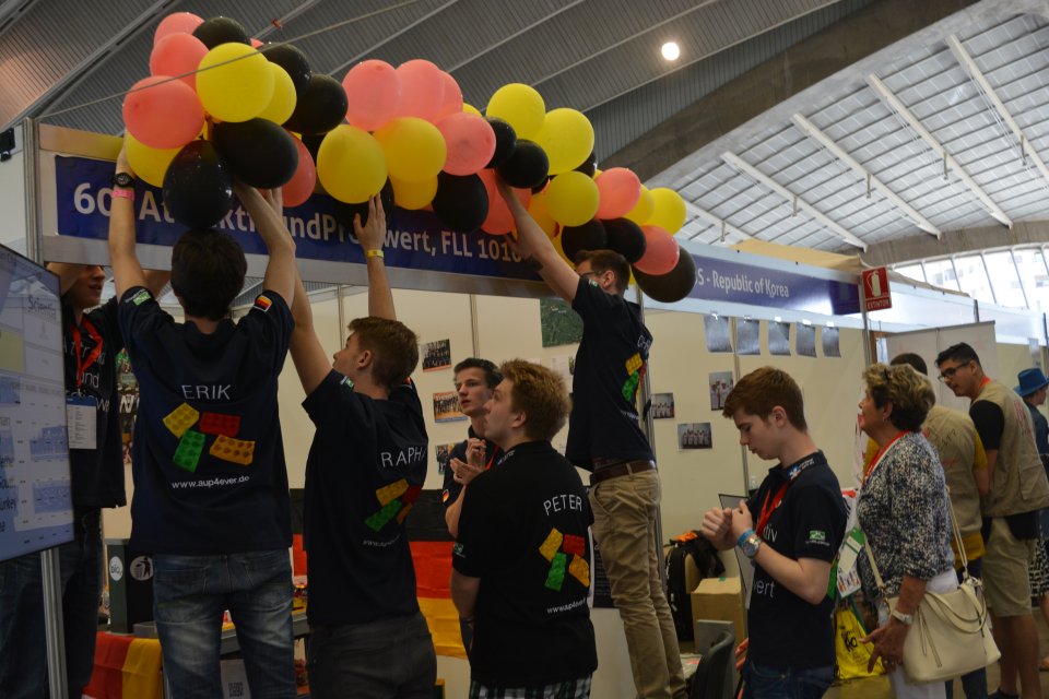 Am Mittwoch ging es dann mit dem Bus zur Kongresshalle in Santa Cruz. Die knappe Stunde Fahrt wurde schon dazu benutzt, sich mit einem brasilianischen Team bekannt zu machen, welches lautstark für Stimmung in dem Bus sorgte. Am Wettkampfort angekommen, musste nach kurzer spontaner Party vor der Halle der Stand aufgebaut werden: Luftballons in den Deutschlandfarben aufblasen, Poster aufhängen sowie Flyer des Forschungsprojektes auslegen gehörten zu den Aufgaben.