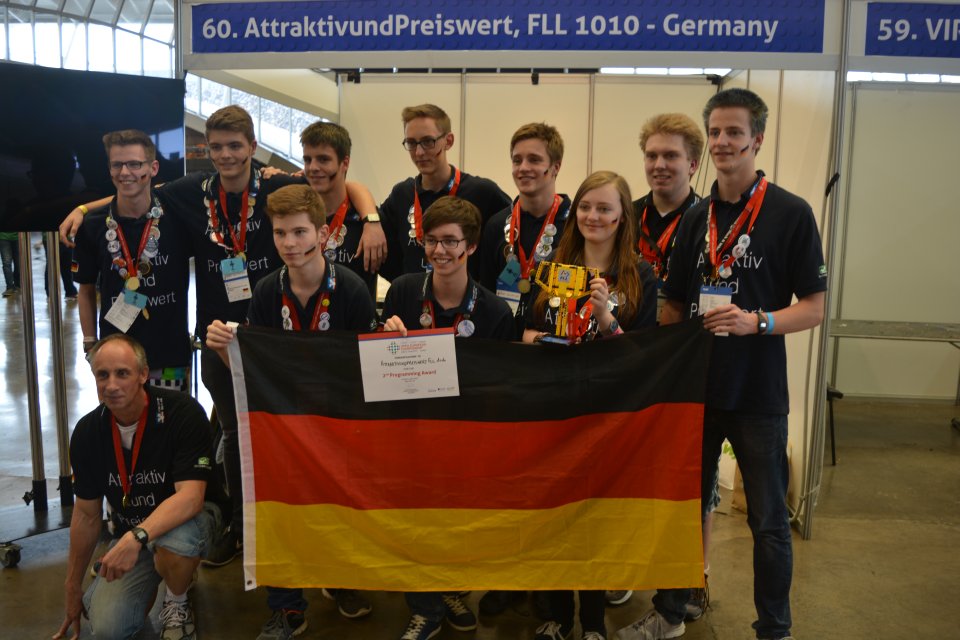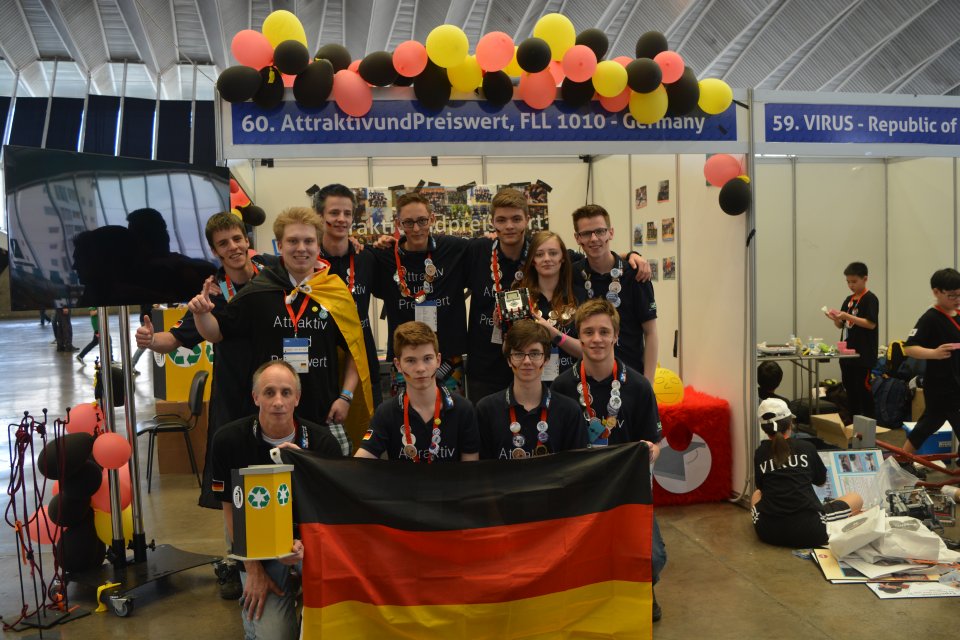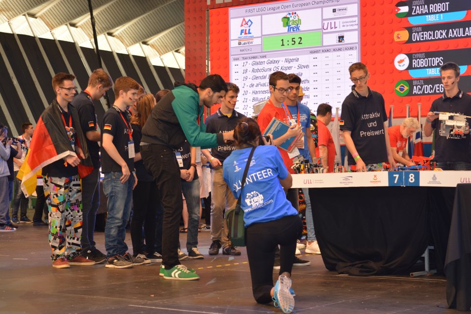 „Nachdem sich das Roboterteam „AttraktivundPreiswert“ des Walburgisgymnasiums in Debrecen (Ungarn) souverän für die „Offene Europameisterschaft“ qualifiziert hatte, gingen die Vorbereitungen für diesen Wettkampf, der den diesjährigen Abschluss der FLL-Saison (First-Lego-League) sowie den Höhenpunkt des nun seit mehr als drei Jahre zusammen arbeitenden Teams bilden sollte, los. Der Roboter wurde weiterhin optimiert, so dass er im Robotgame auf dem vorgegebenen Spielfeld möglichst viele Punkte sammeln sollte. Der Forschungsvortrag zum Thema Mülltrennung wurde noch unzählige Male geübt und interessanter gestaltet. Zudem hatte das Team die Aufgabe, eine Art Präsentationsstand zu planen, mit dem es sich auf dem viertägigen Event auf Teneriffa der Jury, aber auch den aus allen Teilen der Welt angereisten Mannschaften vorstellen sollte. Hierzu wurden Plakate entworfen, auf denen einerseits der Weg bis in dieses Finale nachgezeichnet wurde, die aber auch andererseits zeigen sollten, wie sich das Team aus seinen Mitgliedern mit den unterschiedlichsten Interessen gebildet hatte. So verschieden die einzelnen Teammitglieder jedoch sind, die Aufgaben zum Thema „Trash Trek“ hatten sie zu einer Mannschaft zusammen wachsen lassen.