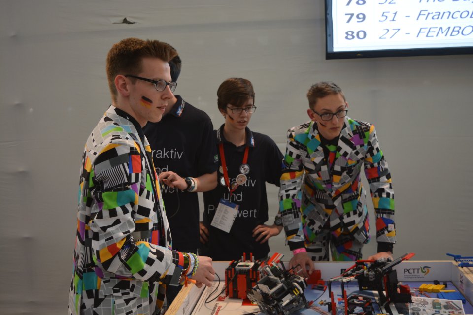 Am letzten Tag, dem Samstag, stand noch ein weiterer Roboterlauf an. Zudem mussten die Teammitglieder den Jurys noch Rede und Antwort stehen, wenn sie den Stand besuchten. Gespannt waren dann alle auf die feierliche Verleihung der Preise, die wieder mit einem Einmarsch begann. Aufgrund dessen, dass der Roboter in den Läufen weit unter seinen Möglichkeiten geblieben war, rechnete nun niemand damit, irgendwo vorne auf dem Treppchen zu stehen. Umso größer war dann die Freude, als das Team „AttraktivundPreiswert“ den zweiten Preis in der Kategorie „Roboterprogrammierung“ bekam. Bei diesem Preis befasst sich eine Jury mit der komplexen Programmstruktur des Roboters und bewertet dabei die Innovationen und komplexen Strukturen zur Aufgabenbewältigung. Nur das deutsche Team „cassapeia“, welches in dieser Saison die meisten Punkte beim Robotgame sammeln konnte und somit darin den Weltrekord hält, wurde von der Jury einen Hauch besser gesehen. Das Team des Walburgisgymnasiums kann daher mächtig stolz darauf sein, in dieser Kategorie knappe 80 Mannschaften auf dieser Europameisterschaft hinter sich gelassen zu haben. Nach einer Siegesparty ging es abends zurück.