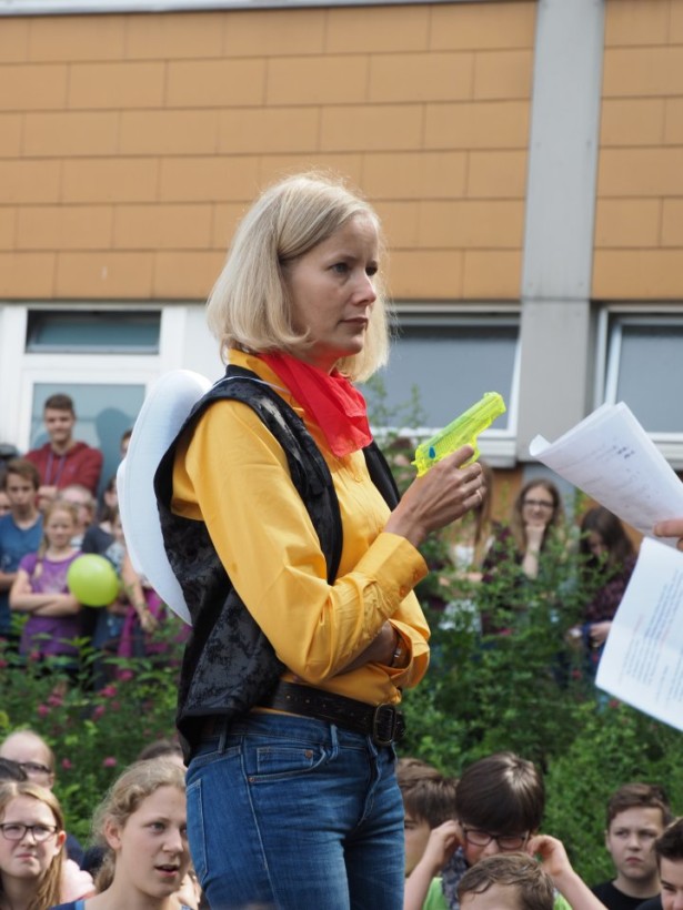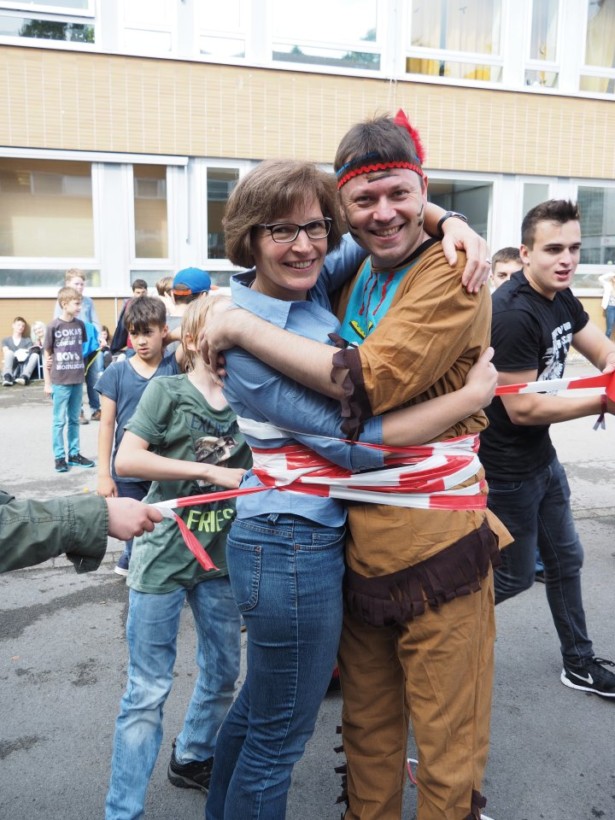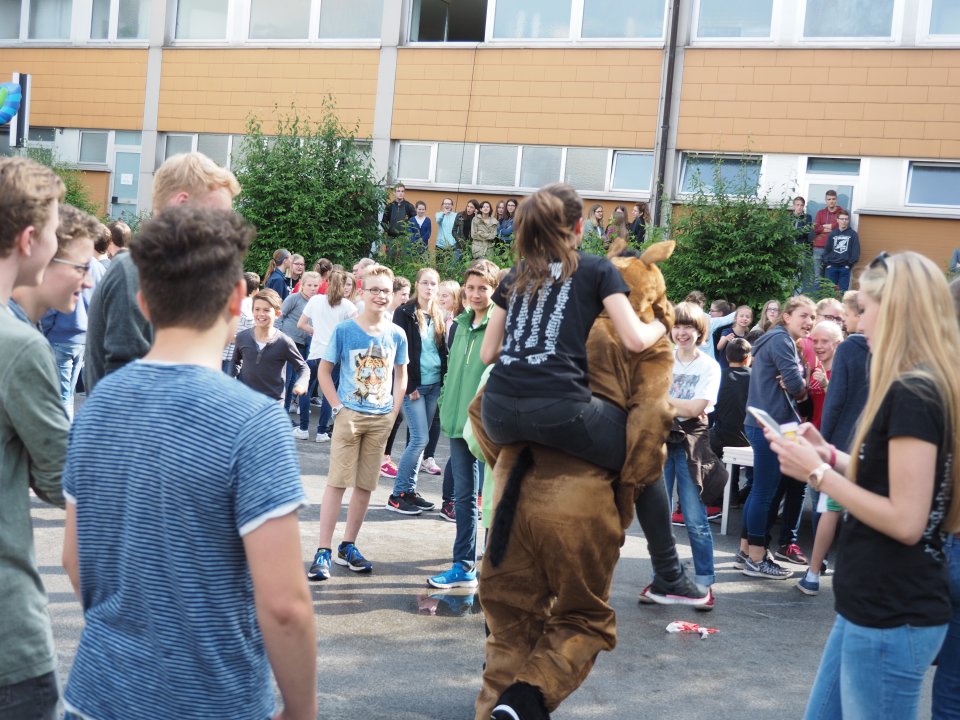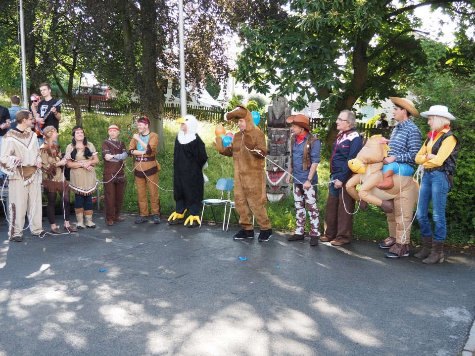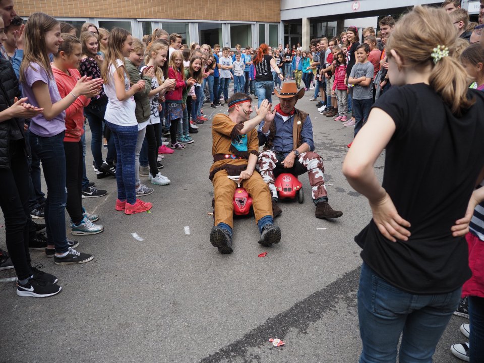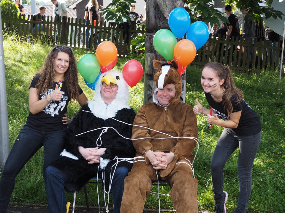 Die Party begann damit, dass die Stufenleiter und LK-Lehrer, eingeteilt in Cowboys und Indianer, gefesselt auf den Schulhof (genauer gesagt den Lehrerparkplatz) geführt wurden. Anschließend mussten sie in Paaren gegeneinander antreten, um die beiden Jahrgangsleiter zu „befreien“. Die abwechslungsreichen Spiele machten allen Zuschauern viel Spaß. Unterstützt wurde das Ganze durch die Stufenband und eine eigens aufgestellte Hüpfburg für die Kleinen und sonstigen Junggebliebenen.