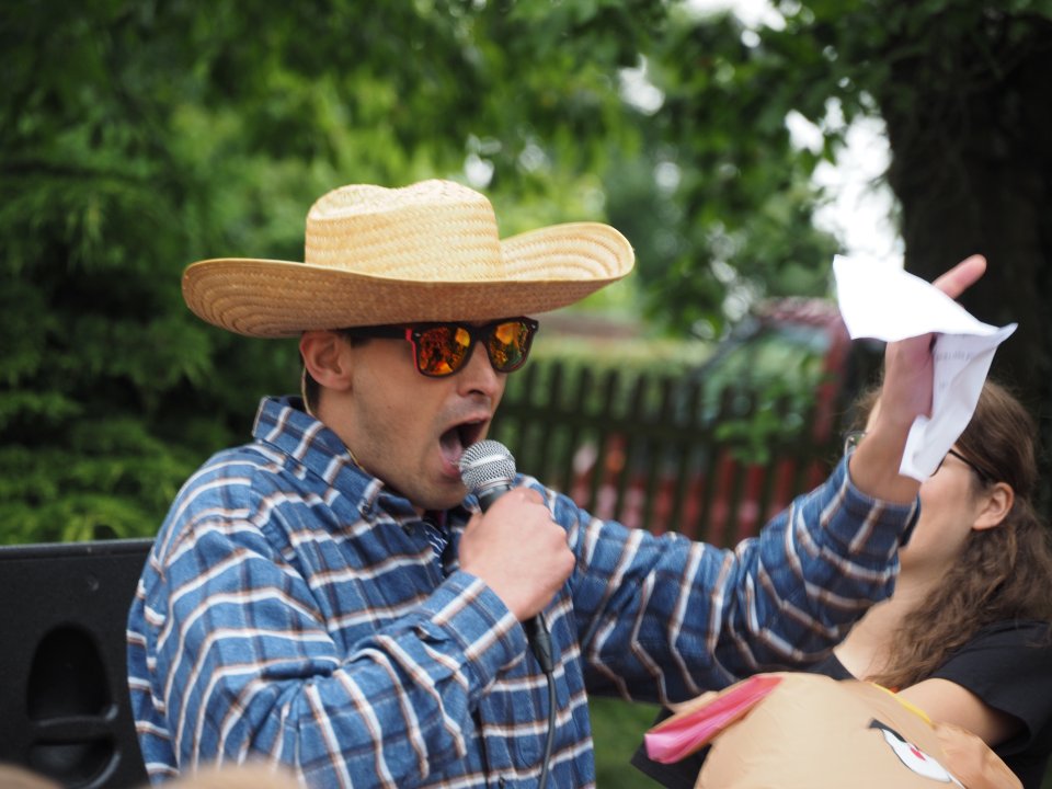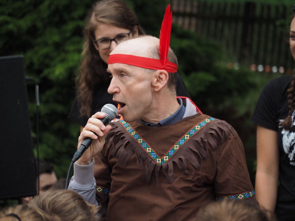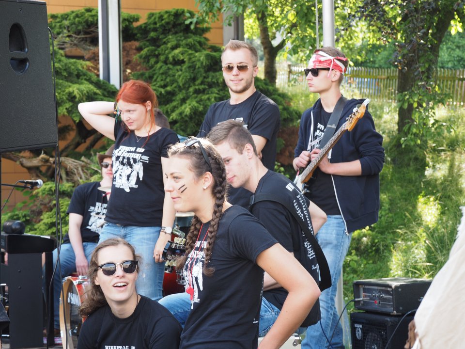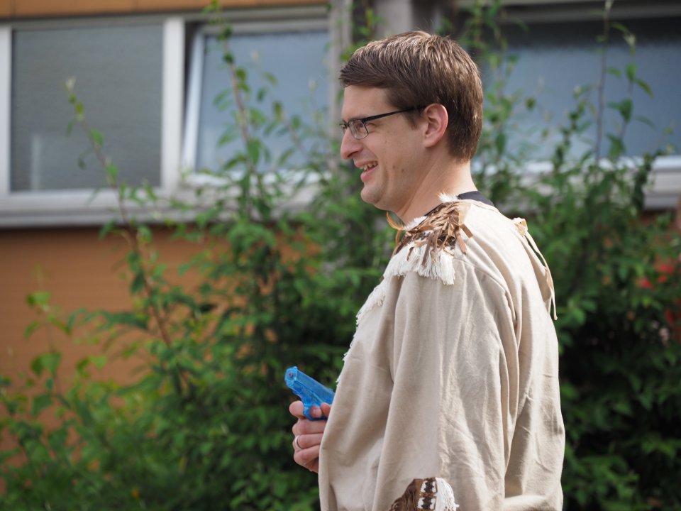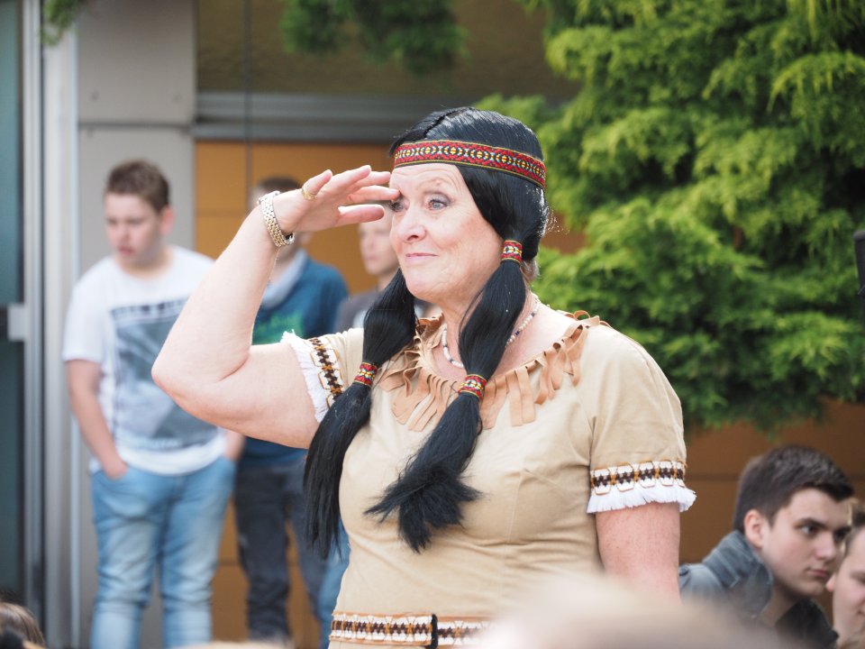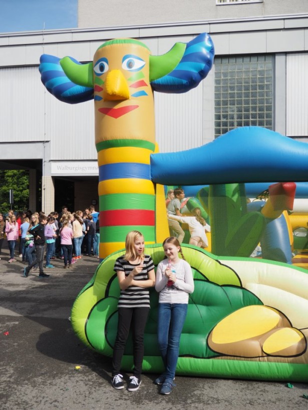 Die Party begann damit, dass die Stufenleiter und LK-Lehrer, eingeteilt in Cowboys und Indianer, gefesselt auf den Schulhof (genauer gesagt den Lehrerparkplatz) geführt wurden. Anschließend mussten sie in Paaren gegeneinander antreten, um die beiden Jahrgangsleiter zu „befreien“. Die abwechslungsreichen Spiele machten allen Zuschauern viel Spaß. Unterstützt wurde das Ganze durch die Stufenband und eine eigens aufgestellte Hüpfburg für die Kleinen und sonstigen Junggebliebenen.