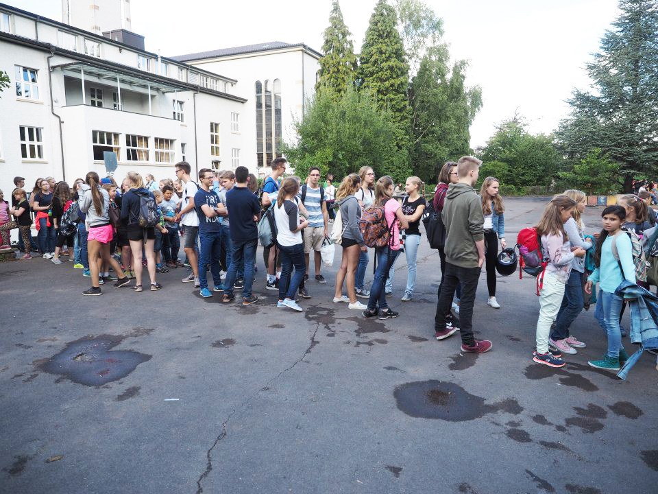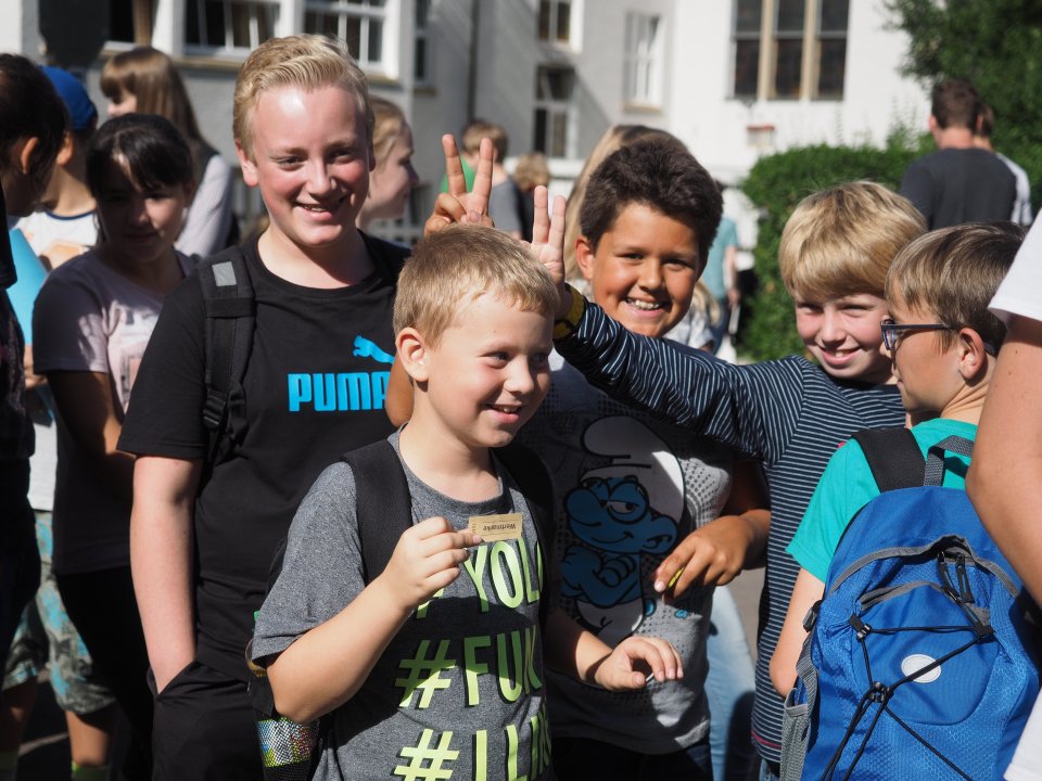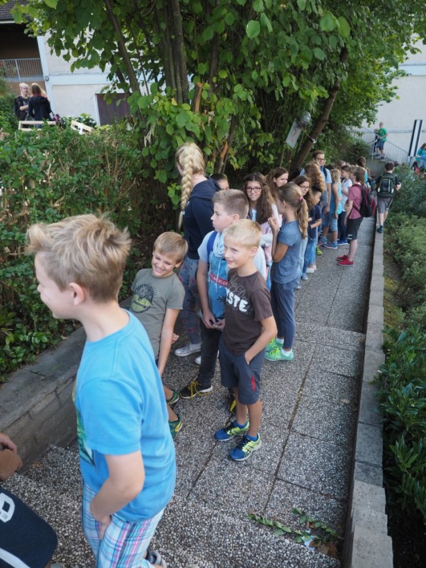 Die Klasse 5c während bei der Stadtführung in Menden während der Projekttage (Foto: Koester/SMMP)Für unsere Neuankömmlinge, die neuen fünften Klassen, gab es übrigens während der Projekttage aufgrund des kurzen Vorlaufs ein eigenes Programm: Am Mittwoch gab es eine Stadtführung in Menden (siehe Foto), am Donnerstag wanderte man gemeinsam von der Schule ins Biebertal um dort zu grillen, und am Freitag gab es eine Bastelstunde zur Verschönerung des Klassenraums.