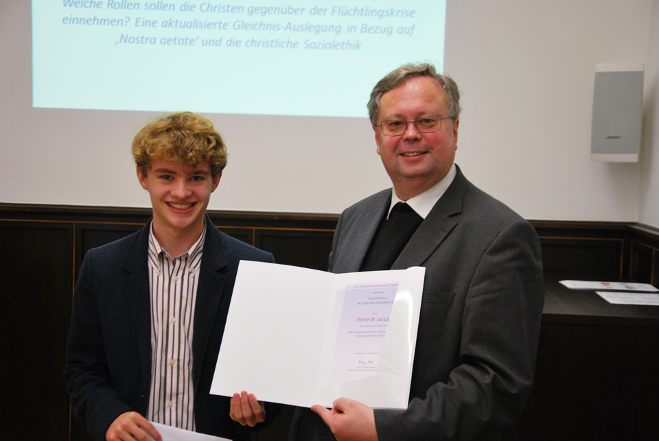 Einen großartigen Erfolg konnte Peter Jaeger, Schüler der Jahrgangsstufe Q2, bei dem diesjährigen Essay-Wettbewerb der Theologischen Fakultät Paderborn erzielen: Er erreichte den mit 500€ dotierten ersten Preis, den er im Rahmen einer feierlichen Preisverleihung am 16. November zusammen mit einer Urkunde aus den Händen des Rektors, Prof. Dr. Rüdiger Althaus, in Empfang nehmen durfte.