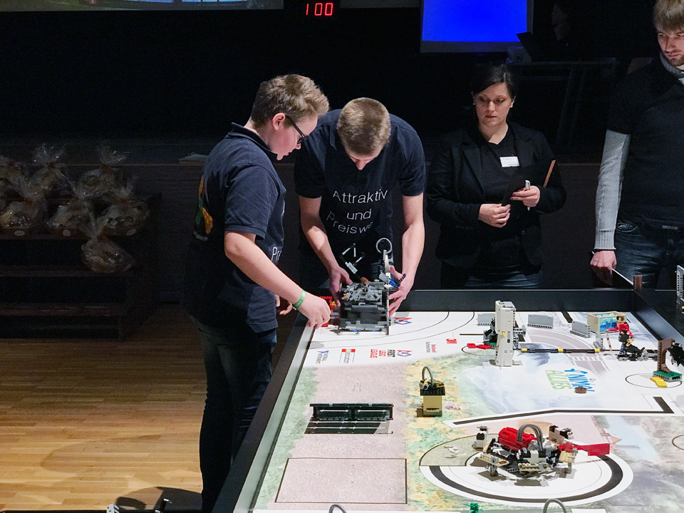 Am Samstag hat unser Team AttraktivundPreiswert den Regionalwettbewerb der First-Lego-League im verschneiten Wenden sehr erfolgreich gemeistert und mit dem Gesamtsieg das Ticket für das zentraleuropäische Halbfinale in Aachen am 22.01.2017 gelöst. Zusätzlich konnten der erste Platz im Robot-Game mit großem Vorsprung und drei zweite Plätze in den weiteren Kategorien Teamspiel, Forschungsvortrag und Robot-Design gefeiert werden. In der kommenden Woche stehen nun einige Optimierungen an. Am Sonntag soll dann in Aachen die Erfolgsstory von AuP weitergehen.