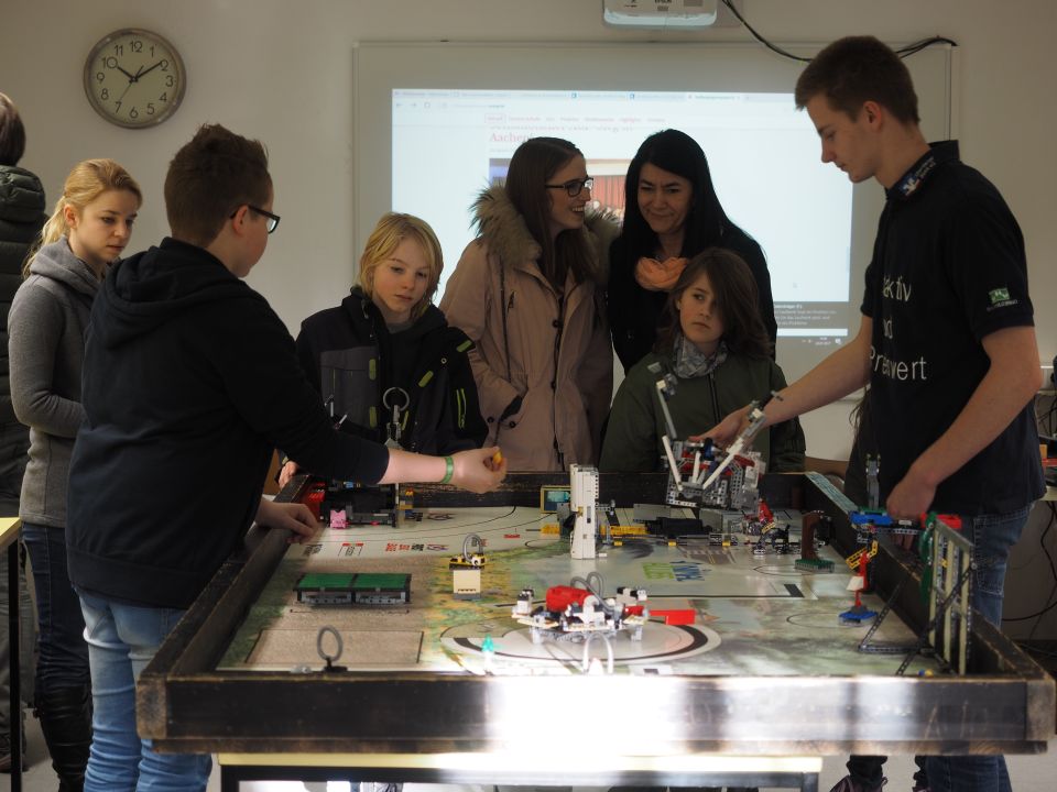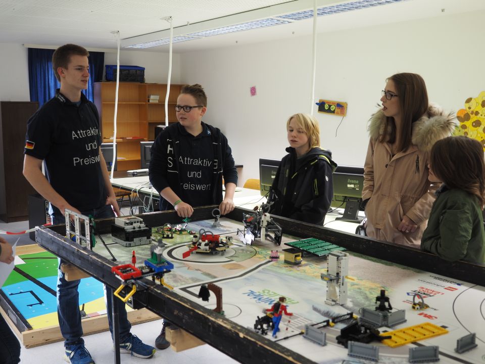 Besonderes Lob verdienen auch die Mitglieder unserer Roboter-AG, die ihre Arbeit im Kellergeschoss des Fachtraktes geduldig vorstellten, und das, obwohl sie zur Zeit mitten in den Vorbereitungen auf das zentraleuropäische Finale der First Lego League stecken, das Anfang März in Regensburg stattfinden wird.