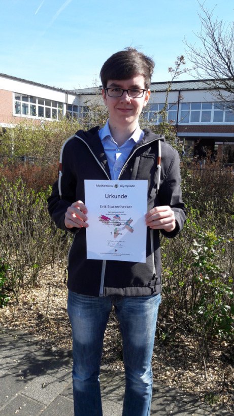 Ebenfalls sehr erfolgreich auf NRW-Landesebene, dieses Mal im Rahmen der Mathematik-Olympiade, war Erik Sturzenhecker (Jg. Q2). Um dort überhaupt teilnehmen zu können, musste er zunächst einmal 15000 Teilnehmer der Schul- und Regionalrunde hinter sich lassen, was ihm als einzigem Oberstufenschüler aus dem Märkischen Kreis gelang. Er errang dort einen erfreulichen zweiten Preis. Das machte ihm Mut, auch noch beim „Bundeswettbewerb Mathematik“ anzutreten. Sollten sich dort ähnliche Erfolge einstellen, werden wir gerne wieder berichten. Auf jeden Fall drücken wir auch hierfür die Daumen!