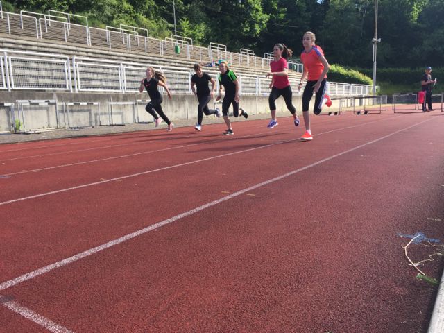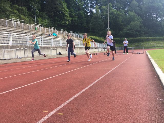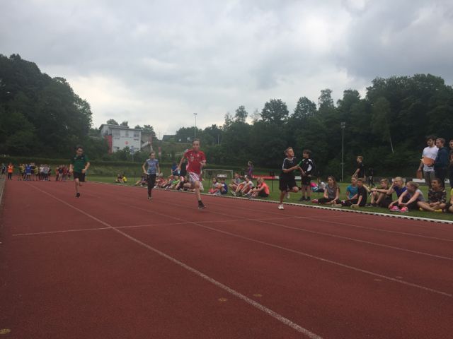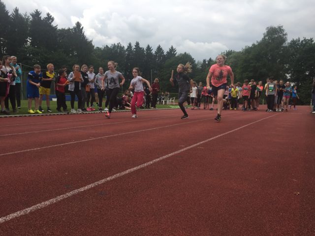 Bei optimalen Wetterbedingungen starteten am Dienstag die fünften und sechsten Klassen, während die siebten bis neunten Klassen am Mittwoch in strahlendem Sonnenschein antraten. Doch auch die im Vergleich höheren Temperaturen taten der Motivation keinen Abbruch. In den verschiedenen Disziplinen traten die Schülerinnen und Schüler mit der Aussicht auf eine Urkunde an. Den Höhepunkt bildeten an beiden Tagen die Pendelstaffeln der einzelnen Jahrgänge. Organisatorisch unterstützt wurde das Lehrerkollegium von den Schülerinnen und Schülern der Q1, die als Riegenführer, Zeit- oder Weitennehmer antraten.