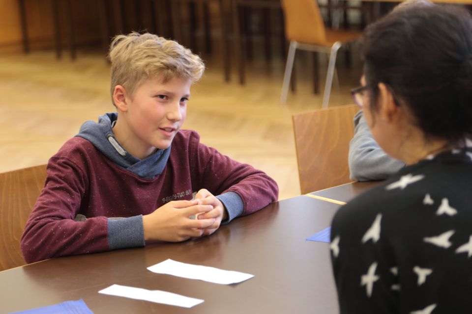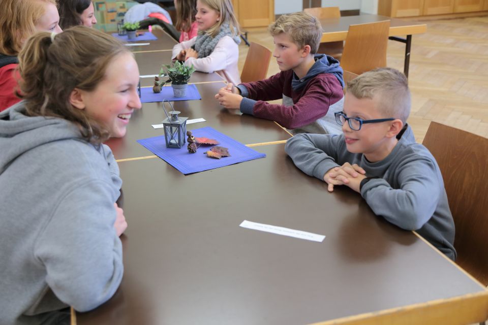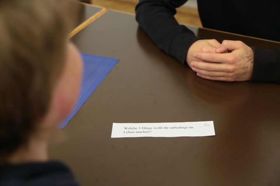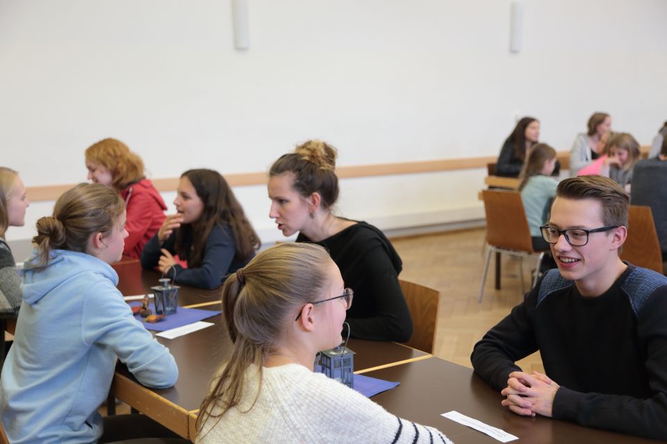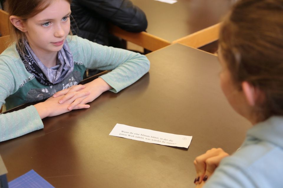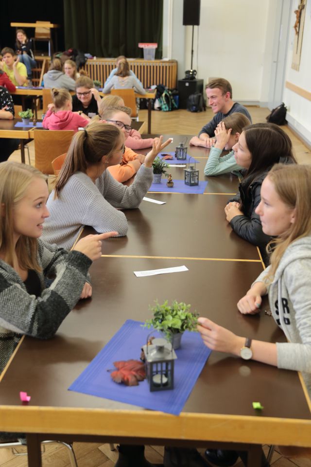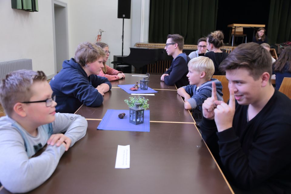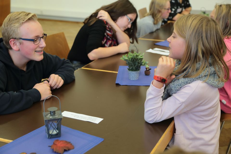 Die Idee des Beitrages unserer SV bestand darin, Schülerinnen und Schülern aus verschiedenen Klassen und Jahrgangsstufen, die im Schulalltag aneinander vorbeilaufen ohne sich zu beachten, die Gelegenheit zu geben, sich besser wahrzunehmen, um die Schulgemeinschaft insgesamt zu stärken. Hierzu setzten sich jeweils zwei Teilnehmer gegenüber an einen Tischkreis und hatten drei Minuten Zeit, sich über ein vorgegebenes Thema kurz auszutauschen. Nach Ablauf der drei Minuten läutete eine Glocke und man rutschte am Tisch entlang zu seinem nächsten Gesprächspartner mit einem neuen vorgegebenen Gesprächsinhalt.
