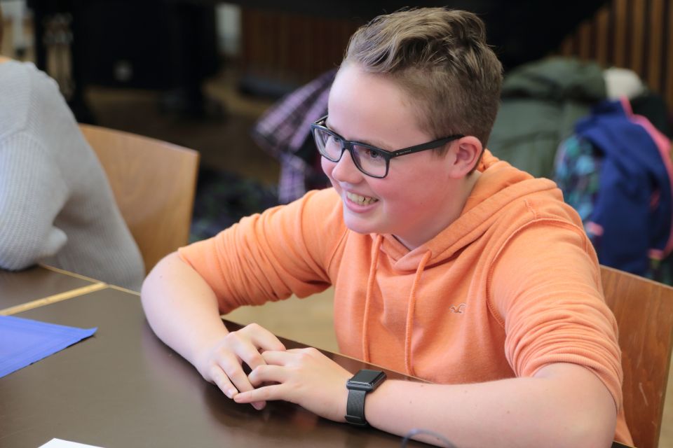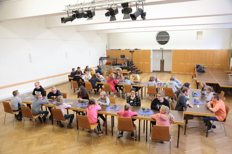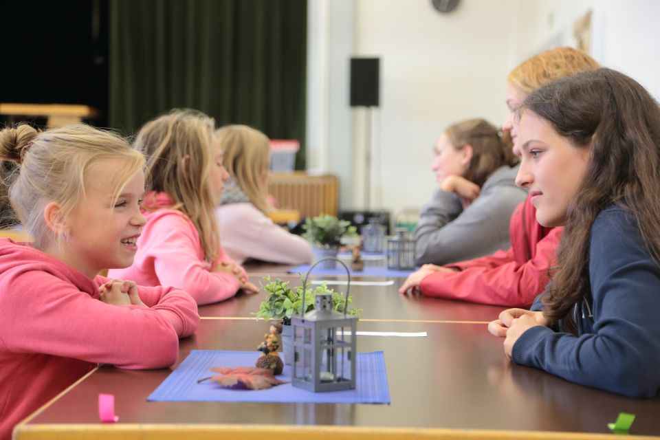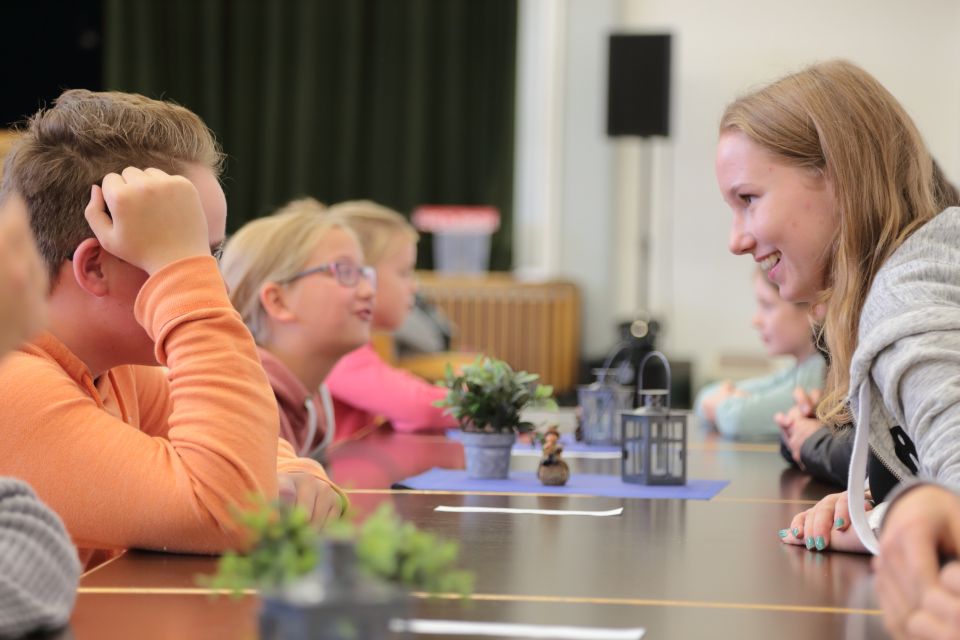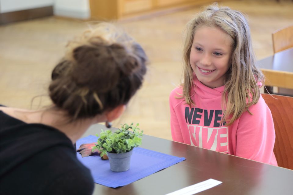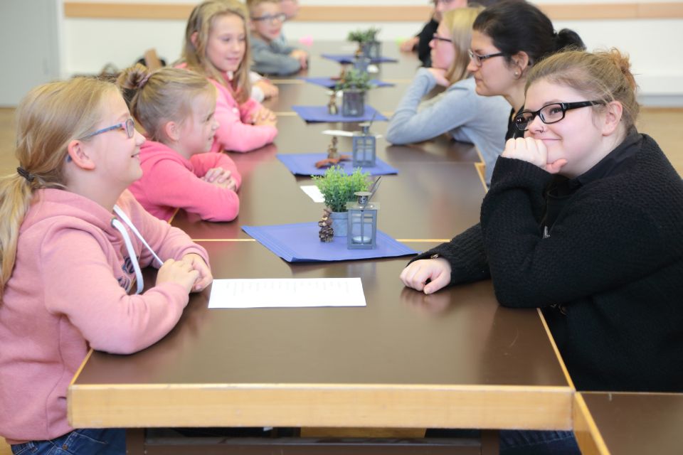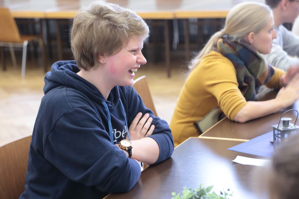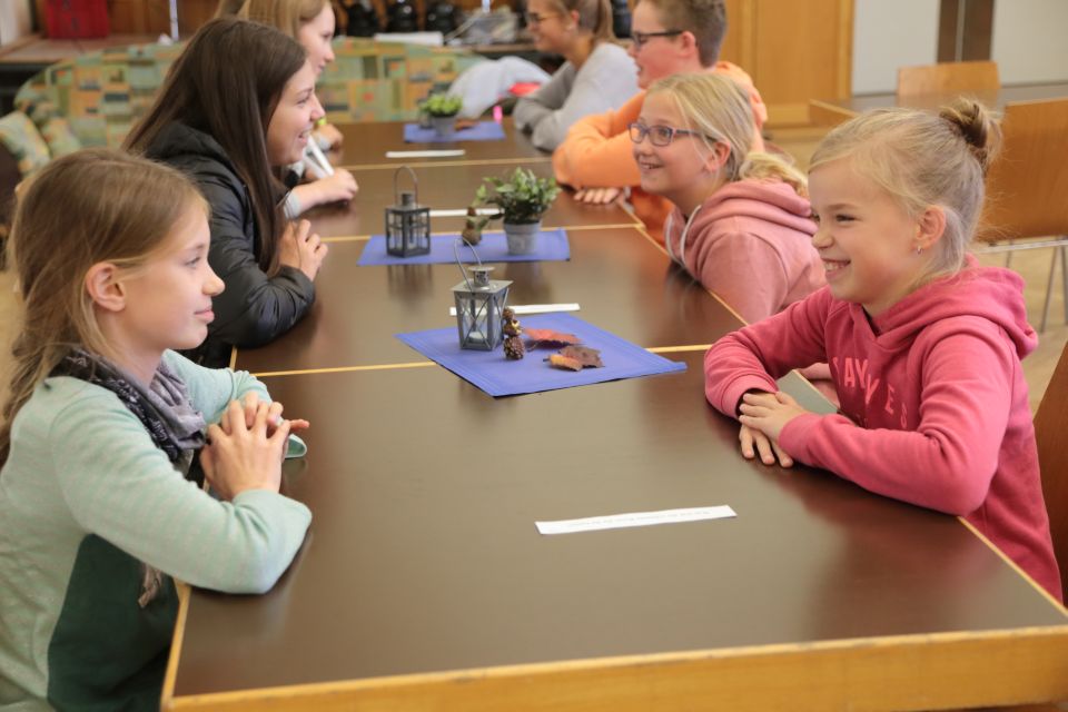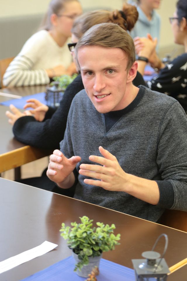 Die Idee des Beitrages unserer SV bestand darin, Schülerinnen und Schülern aus verschiedenen Klassen und Jahrgangsstufen, die im Schulalltag aneinander vorbeilaufen ohne sich zu beachten, die Gelegenheit zu geben, sich besser wahrzunehmen, um die Schulgemeinschaft insgesamt zu stärken. Hierzu setzten sich jeweils zwei Teilnehmer gegenüber an einen Tischkreis und hatten drei Minuten Zeit, sich über ein vorgegebenes Thema kurz auszutauschen. Nach Ablauf der drei Minuten läutete eine Glocke und man rutschte am Tisch entlang zu seinem nächsten Gesprächspartner mit einem neuen vorgegebenen Gesprächsinhalt.