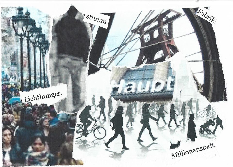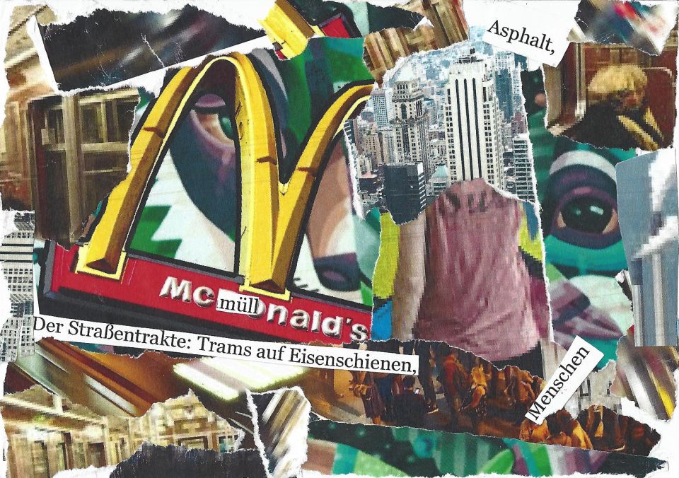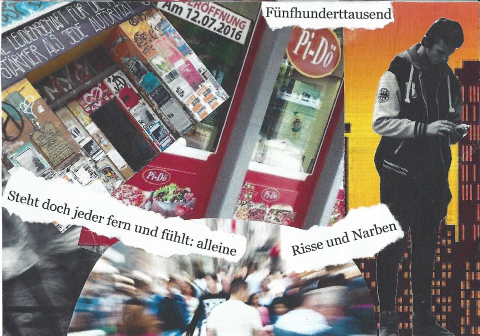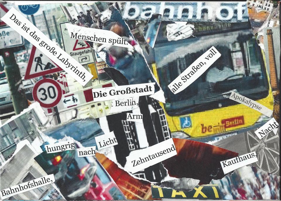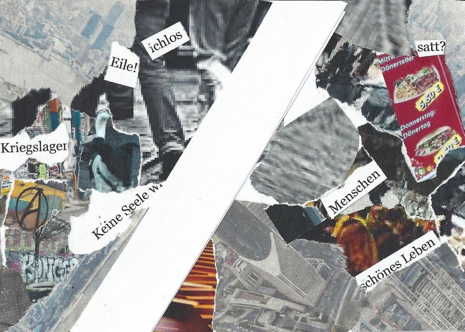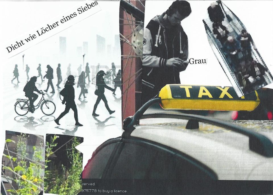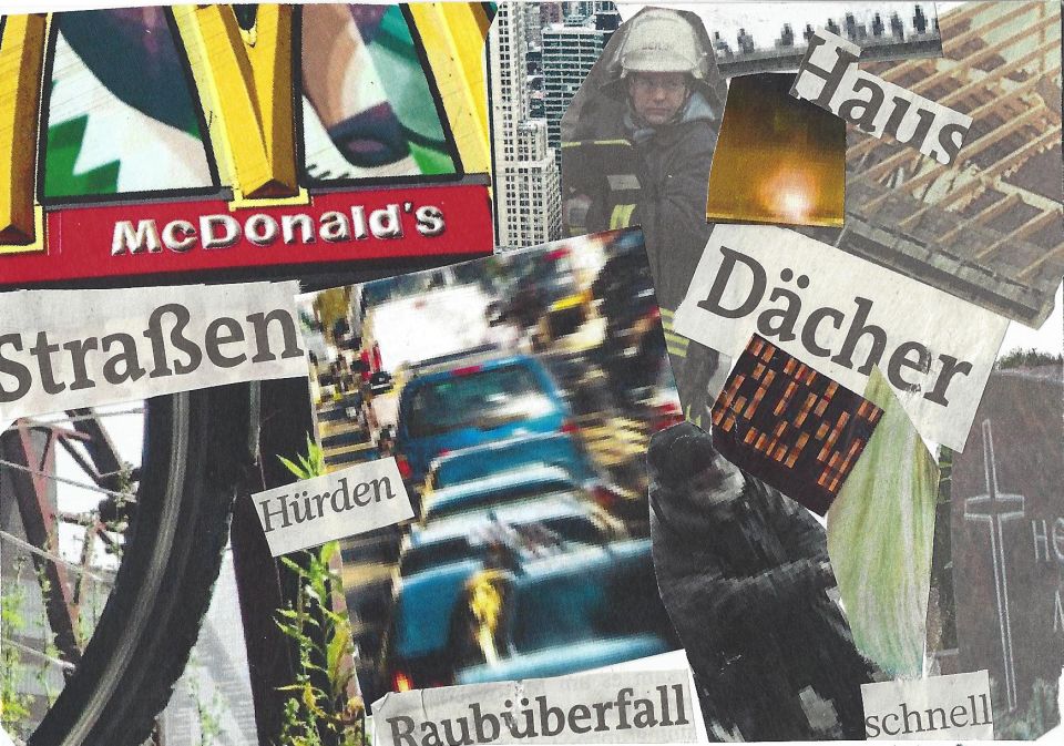 In Anlehnung an die Berliner Ausstellung Arte Postale (Bilderbriefe und Künstlerpostkarten) entstand die Idee der Text-/Bildcollage im Postkartenformat. Das Format – die Postkarte als Anachronismus in unserer schnelllebigen, unverbindlichen Smartphone-Gesellschaft – sollte dabei bewusst einen Kontrapunkt durch die Entschleunigung in der Form setzen, die aber zugleich gesprengt wird durch den Inhalt der Bildbotschaft: Der beschleunigte Mensch in der urbanen, multi-kulturellen Gesellschaft der Moderne.