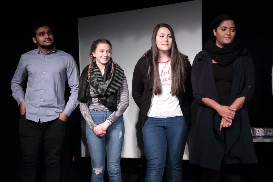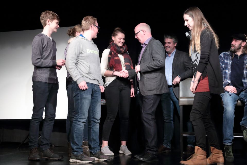 Die Preisverleihung begann quasi rückwärts und Viktoria Markus aus der Stufe 12 des Beruflichen Gymnasiums des „Placida“ konnte für sich und ihren Schulkameraden Jonas Frai den Sonderpreis (Gutschein der Buchhandlung Daub) für eine Kurzgeschichte gegen Fremdenhass entgegen nehmen. Der Pädagogik-LK der Jahrgangsstufe 12 erhielt wegen der besonderen Güte ihres Videos einen Sonderpreis und viel Zuspruch aus dem Publikum. (Foto: C. Scholz/SMMP)Der zweite Sonderpreis (Geldpreis und Menden-Gutschein) ging an den Pädagogik-Leistungskurs der Q2 des Walburgisgymnasiums. Die Schlagworte Menschlichkeit, Akzeptanz und Zivilcourage hatte der Kurs in einen fünfminütigen Film eingebracht, der mit Unterstützung von Jens Pögel von Pögel Media produziert worden war und deshalb außerhalb der regulären Wertung lief.