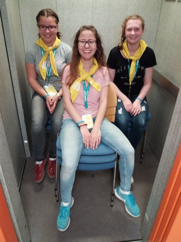 Unser Team wurde verstärkt durch fünf ehemalige Walburgisschüler, die schon bei früheren Katholiken- und Kirchentagen im Einsatz waren und wertvolle Erfahrungen, nicht nur, aber auch für die richtige Technik beim obligatorischen Papphockern beisteuern konnten. Schön war der Kontakt mit den vielen Kindern, die die verschiedenen Workshops besuchten.