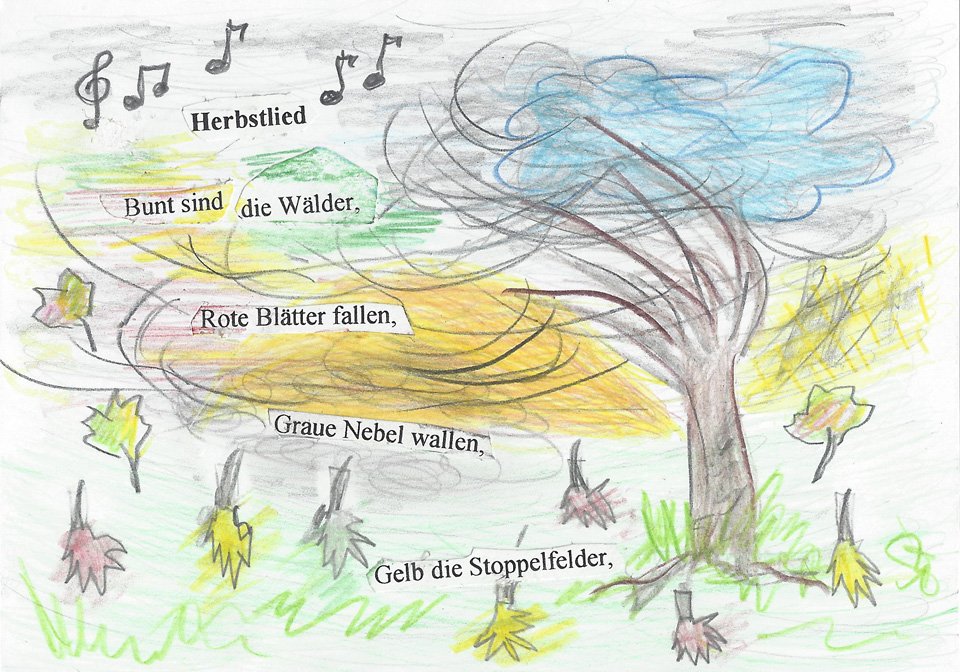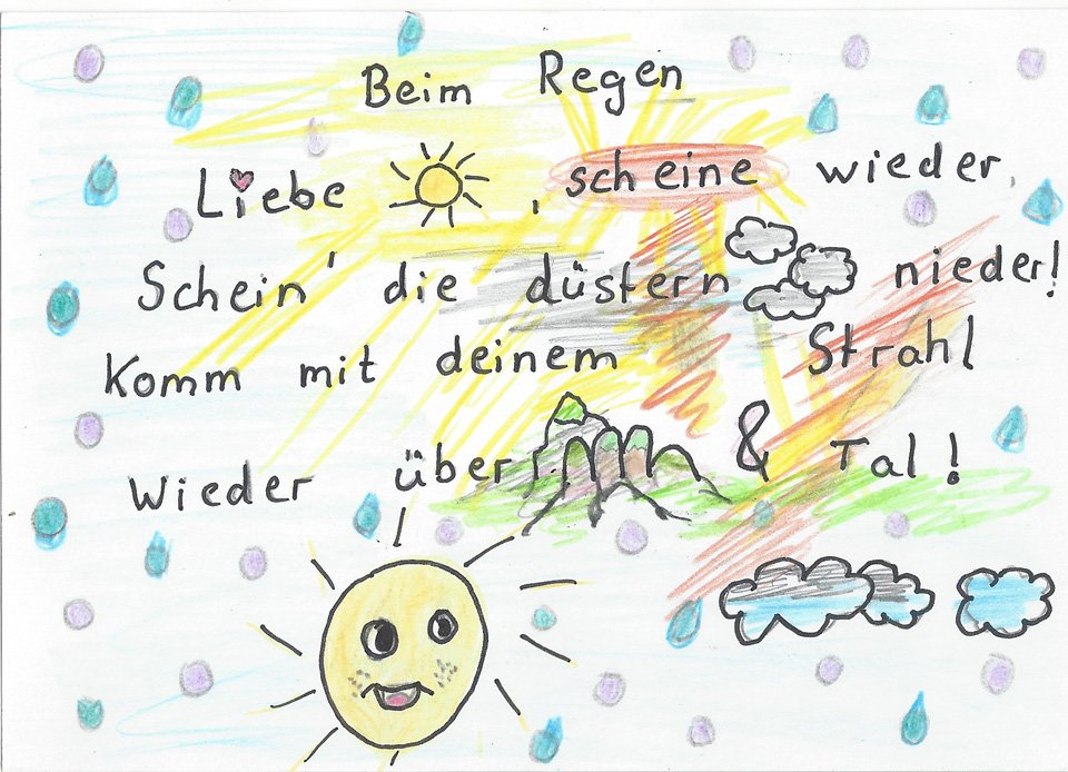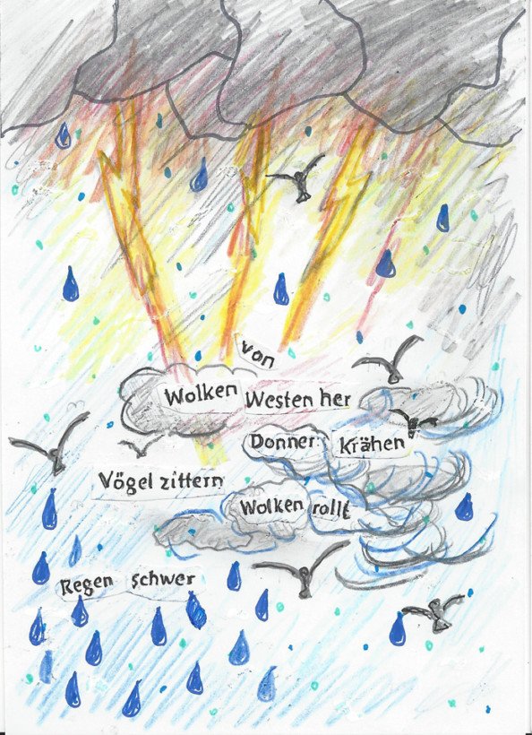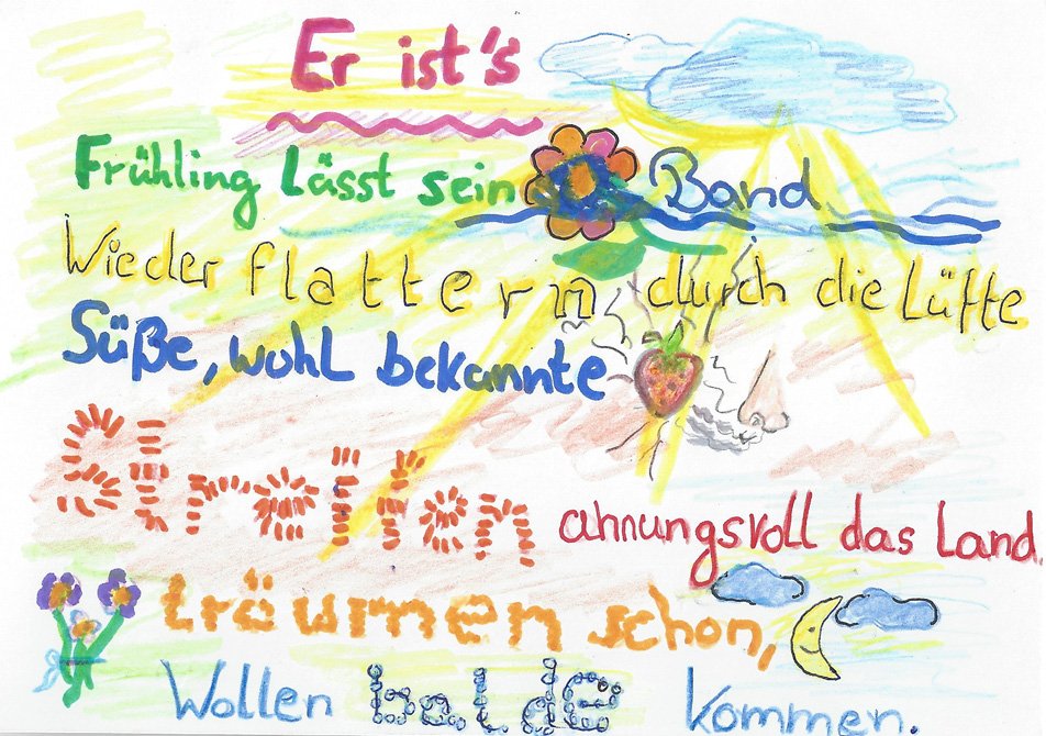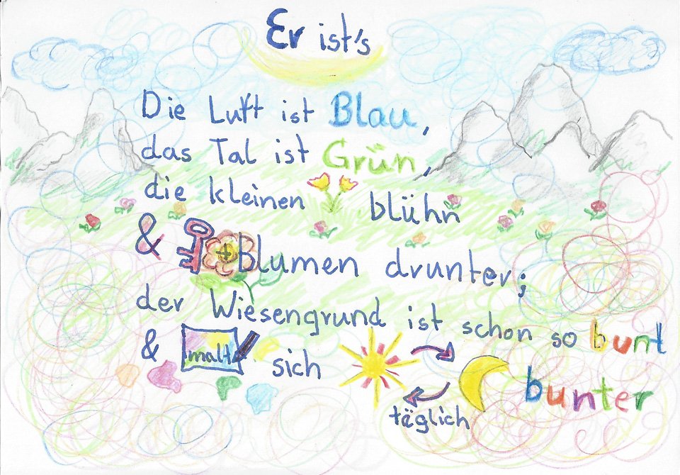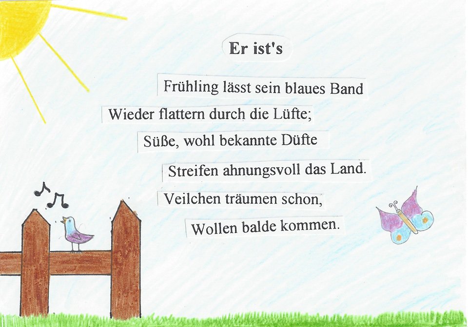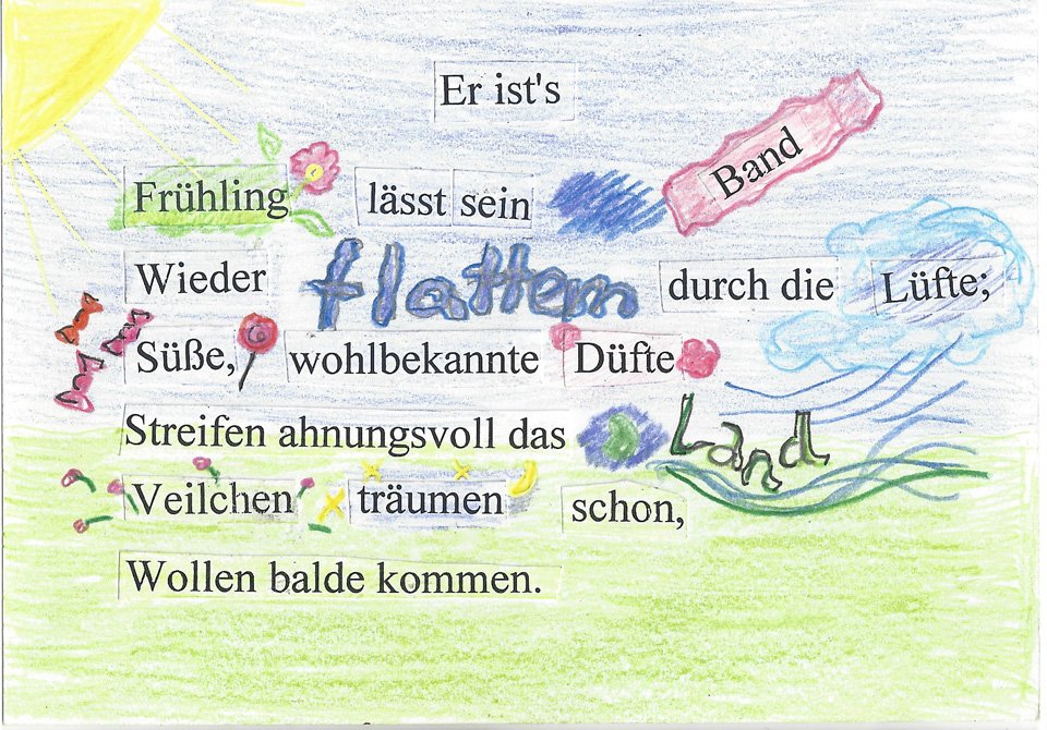 Die Schüler und Schülerinnen kreierten dann auch mit Feuereifer ihre „Jahreszeiten(Gedicht)Postkarten“ und näherten sich in Etappen – lesen, auswählen, strukturieren, reduzieren, gestalten – dem Endprodukt. Auch wenn hier und da Tipps und Hilfestellungen bei der Umsetzung nötig waren, gibt die kleine Galerie (bitte unten auf „Weiterlesen“ klicken) mit einer Auswahl der fantasievollen Postkarten einen guten Einblick in die Möglichkeiten kreativer Textarbeit.