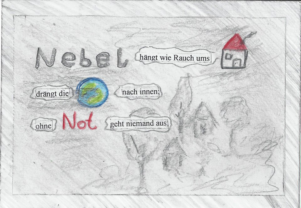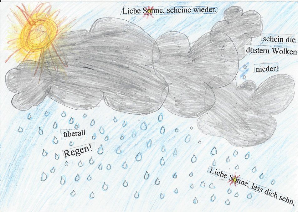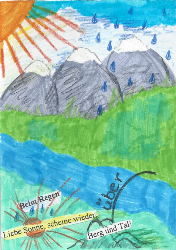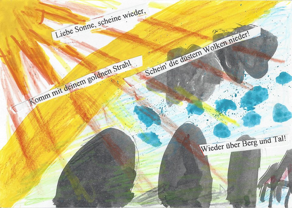 Auf diesen Weg haben sich die Schüler und Schülerinnen der Klasse 5R zusammen mit ihrer Deutschlehrerin Dr. Ute Volkmann in einer Unterrichtsreihe zu „Jahreszeitengedichten“ gemacht. Und am Ende dieses Weges ging es darum, selbst ausgewählte Gedichte zum Thema Vier Jahreszeiten wieder in ein Bild zu überführen, bei dem eine Collage aus Text- und Bildelementen etwas von der atmosphärischen Dichte der Worte in der Gestaltgebung einfängt. Da die Gedichtform per se eine komprimierte ist, stand für die Gestaltungsaufgabe auch wieder nur eine komprimierte Form zur Verfügung – die der Postkarte.