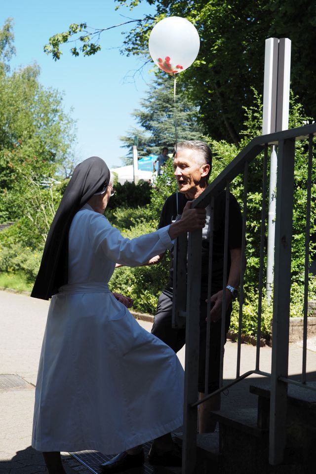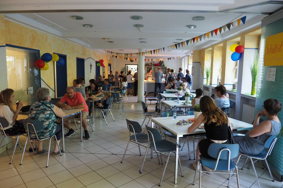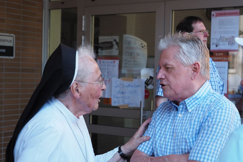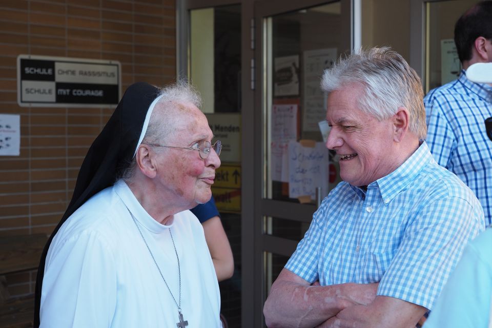 Hier fanden sich zahlreiche Ehemalige, auch ältere Semester und von weither angereist, um Erinnerungen an lange vergangene Zeiten auszutauschen. Besonders erfreulich war hierbei die Anwesenheit unsere ehemaligen Schulleiterin Schwester Maria Virgina, die sich gut erholt von ihrer schweren Erkrankung im vergangenen Jahr zeigte und bei den Gesprächen kräftig mitmischte. Sie war sicherlich in ihrer unverwüstlichen Art ein großes Vorbild für alle Anwesenden.