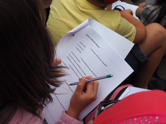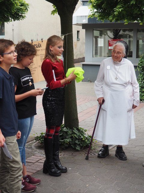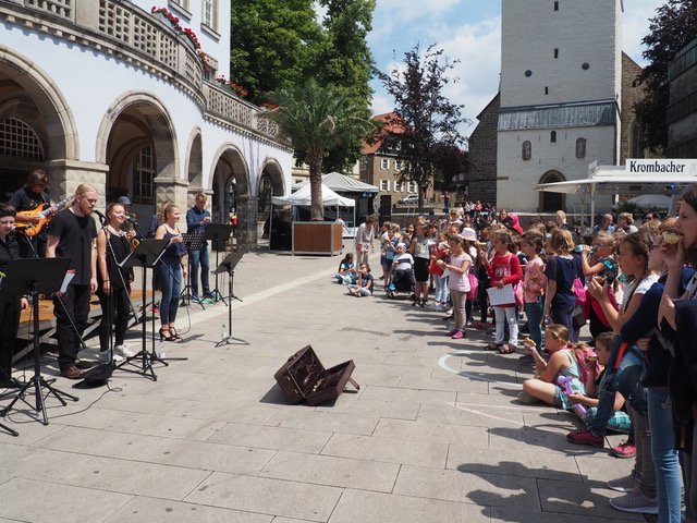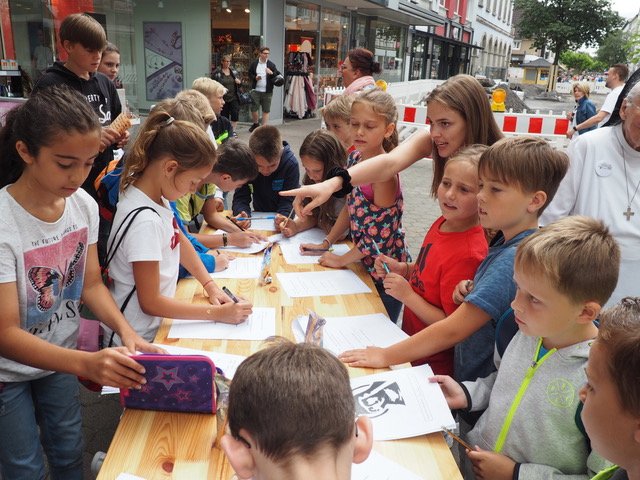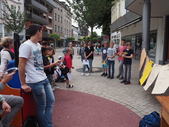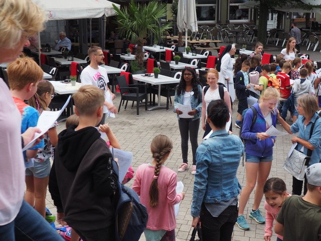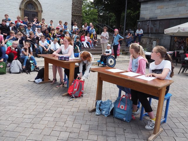 An der Stadtrallye nahmen gut 60 Grundschülerinnen und Grundschüler teil, die sich an 5 sorgsam und abwechslungsreich vorbereiteten Stationen teilweise spielerisch mit der Stadt- und Schulgeschichte auseinandersetzen konnten. Einen besonders kreativen Abschluss bildete das von der 6b einstudierte kleine Theaterstück, welches alle Teilnehmer bei schönstem Wetter auf den Stufen von St. Vincenz mitverfolgen konnten.(Bericht: K. Tillmann/SMMP)