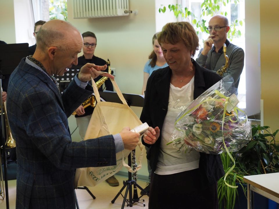 Mehr als 25 Jahre war Roman Demski Hausmeister unserer Schulen und erledigte, wie Schulleiter Dr. Maler dankend hervorhob, zuverlässig Reparaturen, Koordinierung, Vertragen und Stellen (der Aulabestuhlung), Kontrollieren, Abschließen und Vieles mehr. Außerdem – und das ist etwas Besonderes – war er Musiker in Schulbands und mit eigener Band und führte eigene Benefizveranstaltungen für die Anliegen des Ordens durch. Dr. Maler und Musiklehrer Christian Becker dankten dem „rockigsten Hausmeister aller Schulen“ und formulierten denn auch als Motto: „Staying alive“ und „Keep on rocking in the free world“.