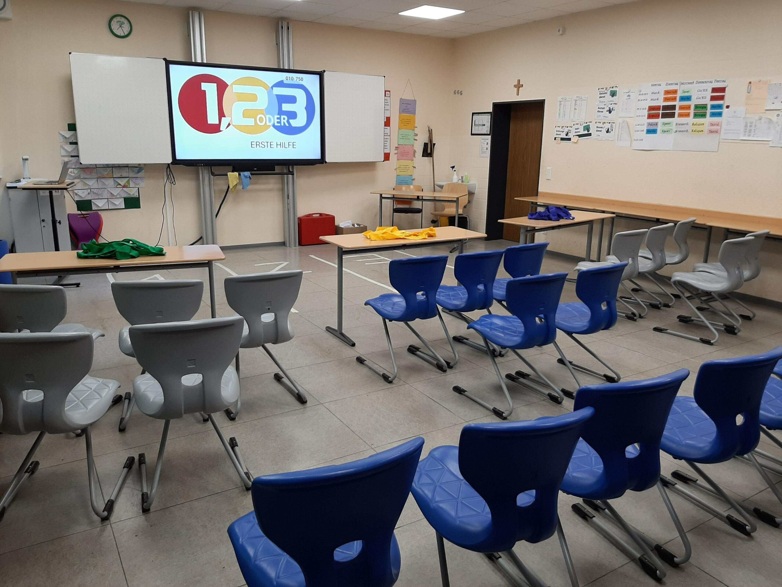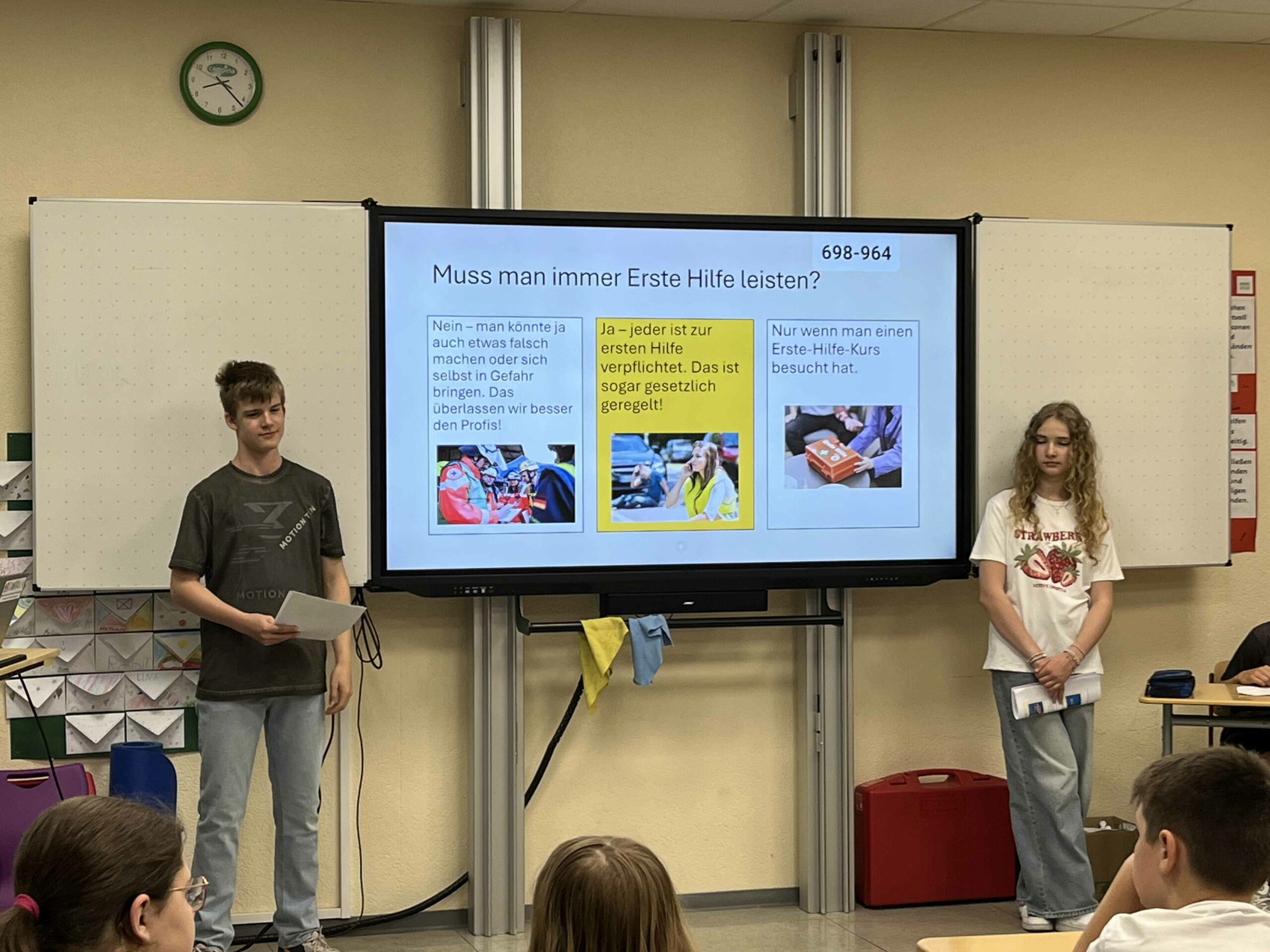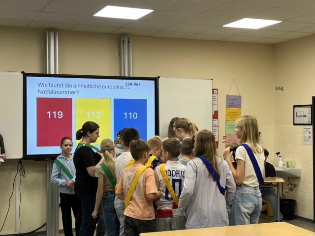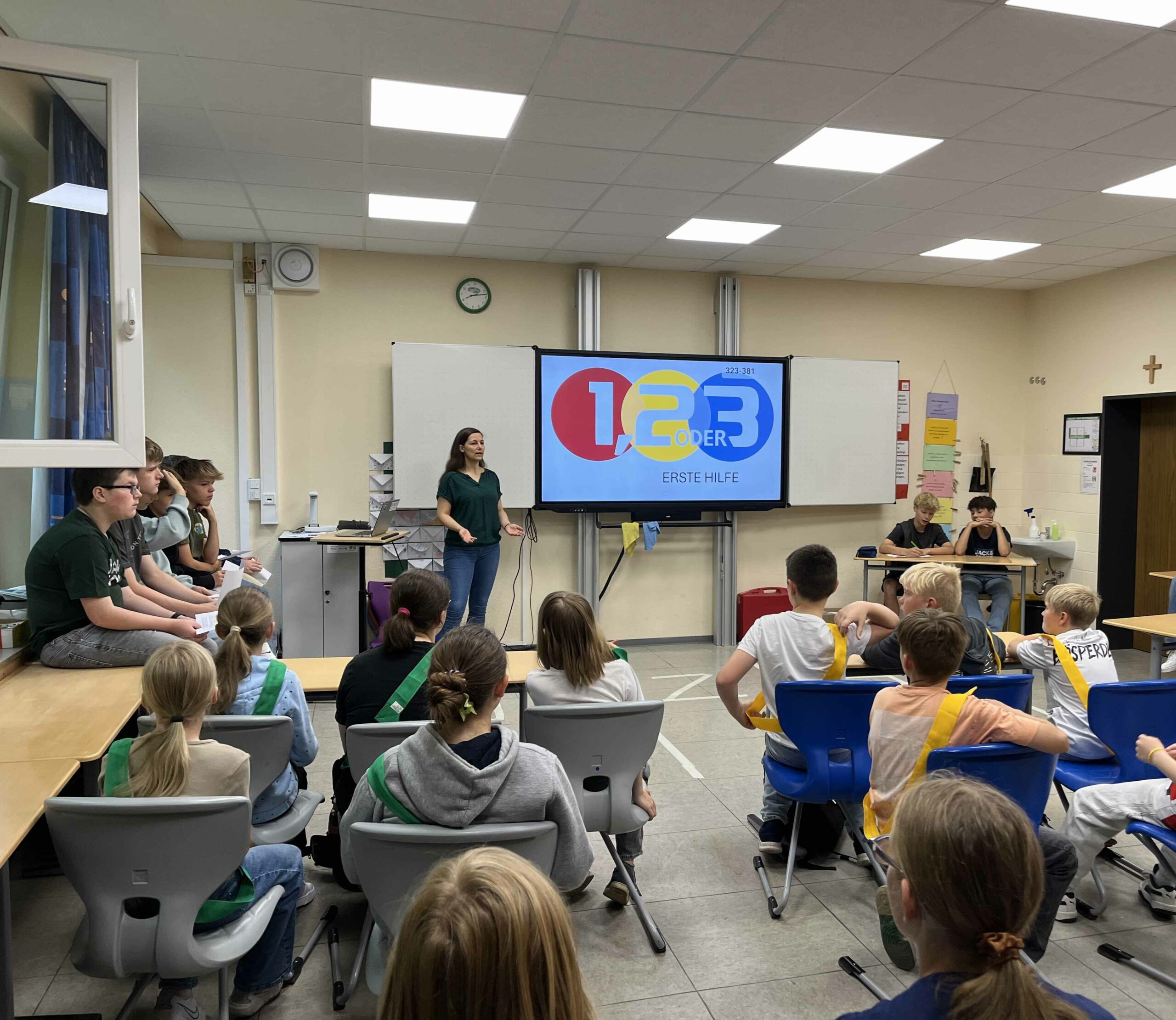 Die Sternstunden-AG in der 7. Klasse, die sich im 2. Schulhalbjahr mit dem Thema Erste Hilfe beschäftigt hat, war in der vergangenen Woche zu Gast in der Klasse 5 der Walburgisrealschule. Gemeinsam führten sie ein interaktives Quiz zum Thema Erste Hilfe durch – angelehnt an die beliebte Fernsehshow „1, 2 oder 3“. Aufgeteilt in die Teams Gelb, Blau und Grün mussten sich die Fünftklässlerinnen und Fünftklässler in 10 spannenden Fragen behaupten und Punkte sammeln. Nach jeder Fragestellung hieß es dann: „1, 2 oder 3, letzte Chance, vorbei!“ Die Mitglieder der Sternstunden-AG übernahmen dabei vielfältige Aufgaben: Sie moderierten das Quiz, bereiteten den Raum vor, zählten Punkte und erklärten die richtigen Antworten. Zudem demonstrierten einige Schüler/-innen anschaulich die stabile Seitenlage und die Schocklagerung.