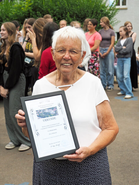 – Frau Ute Brinkschulte, die zunächst als Mutter, später als Großmutter insgesamt 25 Jahre in der Caféteria ehrenamtlich mitgeholfen hat.