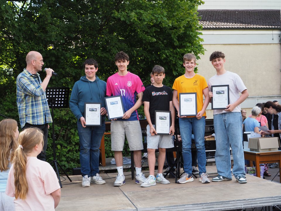Der vierte Block wurde von Herrn Becker übernommen, der die folgenden Schüler für ihren immerwährenden Einsatz in Technikfragen ehrte, insbesondere bei der Betreuung der Aulatechnik während Veranstaltungen wie Konzerte oder Theateraufführungen: