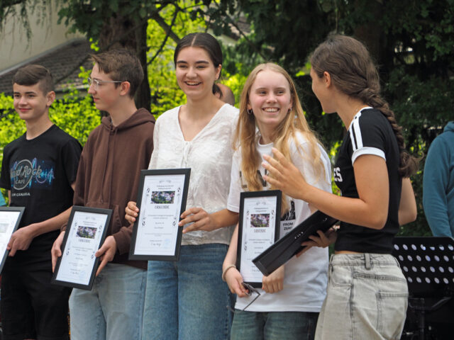 Am heutigen Donnerstag wurde die traditionelle Ehrungsfeier auf dem Schulhof abgehalten, bei dem Schülerinnen und Schüler von WBG und WBR sowie Externe (kein Lehrpersonal) für besondere Leistungen ausgezeichnet werden. Weitere Fotos der Veranstaltung finden sich in der anschließenden Galerie.