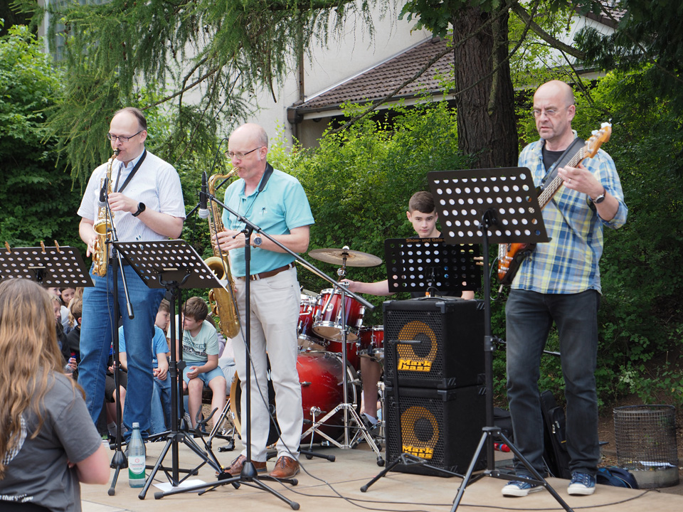Zwischen den Blöcken sorgte die Jazzformation mit Herrn Dr. Bornhoff am Keyboard, Herrn Großerhode und Herrn Hagedorn am Saxophon sowie Julian Fricke aus der 10c am Schlagzeug für kurzweilige Pausen.