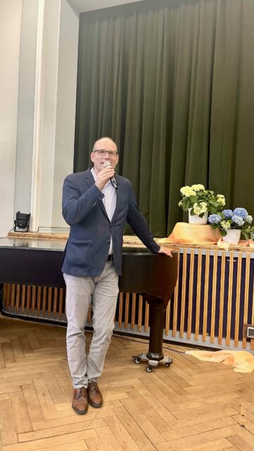 Begrüßt wurden die Kinder von den beiden Schulleitern, Herr Dr. Bornhoff (Gymnasium) und Herr Köchling (Realschule), bevor das erste „große Geheimnis“ gelüftet wurde: die Zusammensetzung der neuen fünften Klassen. Die künftigen Klassenleitungen riefen ihre neuen Schülerinnen und Schüler nacheinander auf. Ein Moment voller gespannter Erwartung, der für viele Kinder der erste ganz persönliche Schritt in die neue Klassengemeinschaft war. Einen besonders feinen Ton setzte Herr Becker, der künftige Klassenlehrer der Vokalklasse 5c: Er begleitete die Verlesung der Namen am Flügel. So entstand eine stillvolle, fast feierliche Atmosphäre.