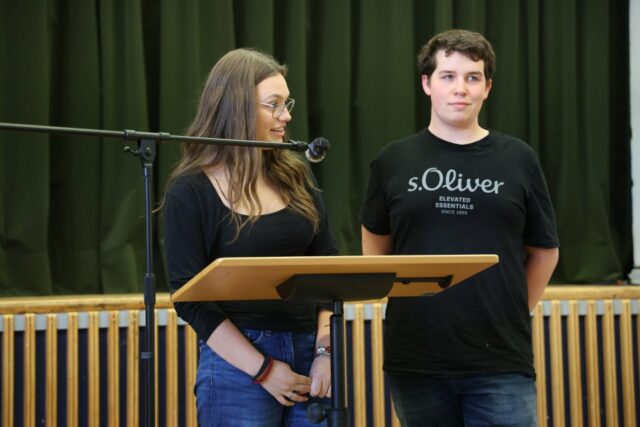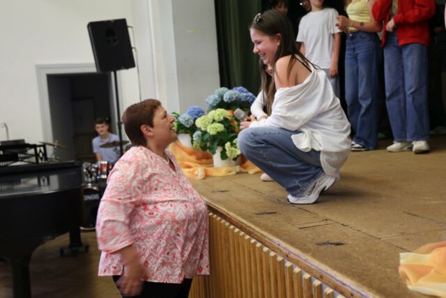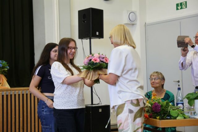 Die Verabschiedungsfeier wurde beendet durch einen kurzen Redebeitrag der Schülersprecher, die Frau Schmidt und Frau Schulte im Namen der Schülerschaft verabschiedeten und sich für ihren langjährigen Dienst am WBG mit jeweils einem Blumenstrauß bedankten.