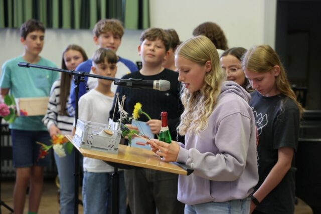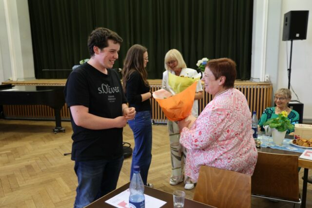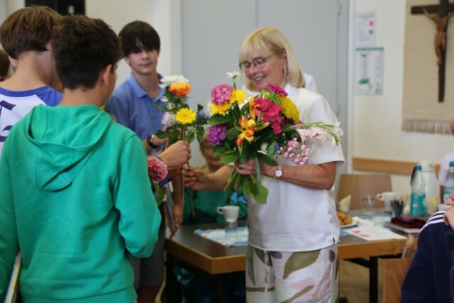 Auch im Falle von Frau Schulte kam es selbstverständlich zu Danksagungen von Schülerinnen und Schülern. Die Klasse 7b packte ihr vor ihren Augen einen Korb mit kleinen Geschenken zum Ruhestand, versehen mit passenden Kommentaren. Abschließend gab es von jedem Mitglied der Klasse eine Blume, so dass am Ende ein sehr ansehnlicher Blumenstrauß zusammenkam. Zwei Schülerinnen aus ihrem Lateinkurs der EF bedankten sich im Namen ihres Kurses ebenfalls mit einem Blumenstrauß.