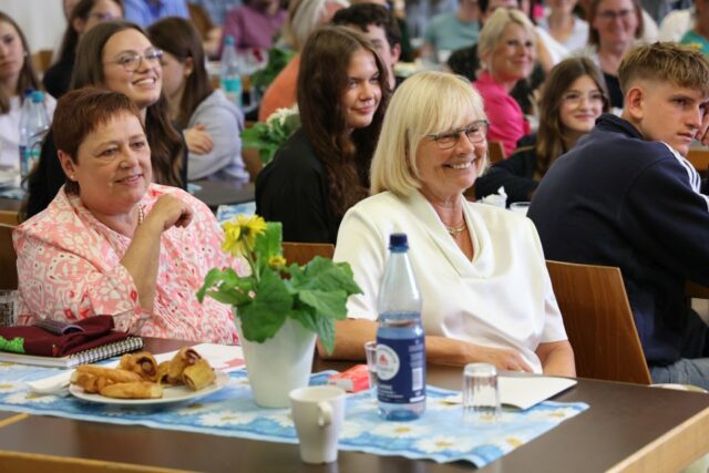 Am vergangenen Donnerstag endete der Unterricht nach der vierten Stunde. Danach versammelte sich die Schulgemeinschaft (bestehend aus dem aktiven Kollegium, ehemaligen Weggefährten, Schülerinnen und Schülern, weiteren Mitarbeiterinnen und Mitarbeitern sowie Angehörigen und Freunden) in der Aula, um zwei verdiente Kolleginnen in den Ruhestand zu verabschieden. Sogar Schwester Raphaela Maria, die am gleichen Tag ihren 88. Geburtstag feierte, und Schwester Heriburg hatten den Weg aus Bestwig auf sich genommen, um Frau Schmidt und Frau Schulte Lebewohl zu sagen und ihnen für ihren weiteren Lebensweg alles Gute zu wünschen.