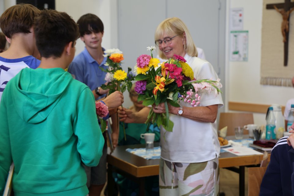 Auch im Falle von Frau Schulte kam es selbstverständlich zu Danksagungen von Schülerinnen und Schülern. Die Klasse 7b packte ihr vor ihren Augen einen Korb mit kleinen Geschenken zum Ruhestand, versehen mit passenden Kommentaren. Abschließend gab es von jedem Mitglied der Klasse eine Blume, so dass am Ende ein sehr ansehnlicher Blumenstrauß zusammenkam. Zwei Schülerinnen aus ihrem Lateinkurs der EF bedankten sich im Namen ihres Kurses ebenfalls mit einem Blumenstrauß.