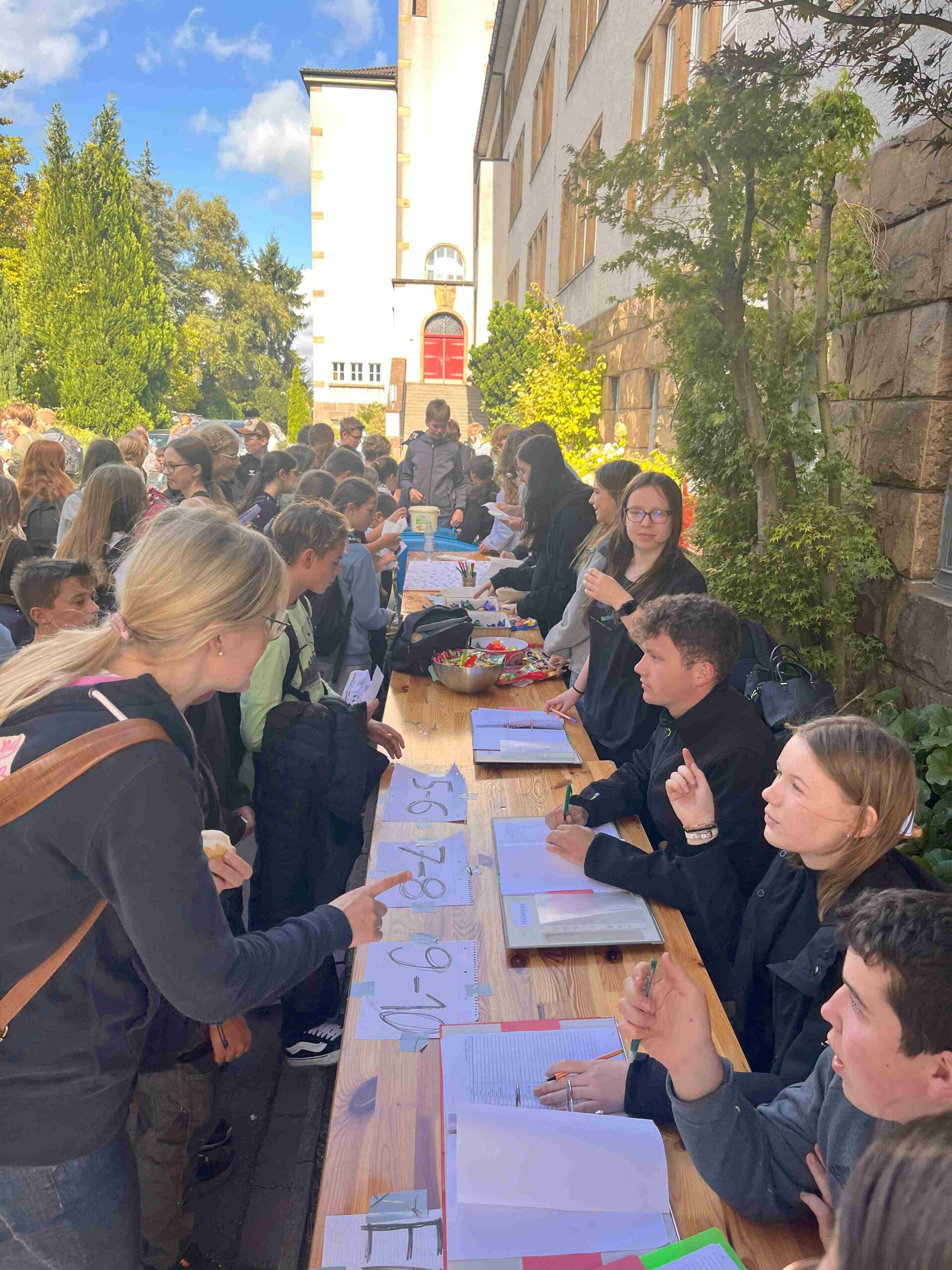 Am vergangenen Montag fand der von der Schülervertretung (SV) organisierte Spendenlauf zugunsten des Amphitheater-Projektes statt. Genauer gesagt hätte man das Wort „reorganisiert“ verwenden müssen, denn eigentlich sollte der Spendenlauf bereits vor den Sommerferien stattfinden, musste aber wegen der Witterungsverhältnisse kurzfristig abgesagt werden. Und so hatte die SV die ganze Vorbereitungsarbeit ein zweites Mal zu stemmen. Trotz der Verschiebung blieben die Stadtwerke dabei, diese Aktion zu unterstützen, indem sie pro mitgelaufener Schülerin bzw. mitgelaufenem Schüler einen Euro spendeten.