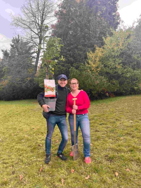 Ganz nebenbei pflanzten unsere Pflegschaftsvorsitzenden Frau Kostorz und Herr Rüschenbaum noch einen Apfelbaum im Unterpark. Im Rahmen der sogenannten Baumpflanzchallenge waren die Walburgisschulen über Instagram vom Pastoralverbund Menden eben dazu aufgerufen worden. Nun bleibt zu hoffen, dass der Baum bereits im nächsten Jahr erste Früchte tragen wird, soll die Ernte doch dem De-Cent-Laden des SKFM Menden zugutekommen.
