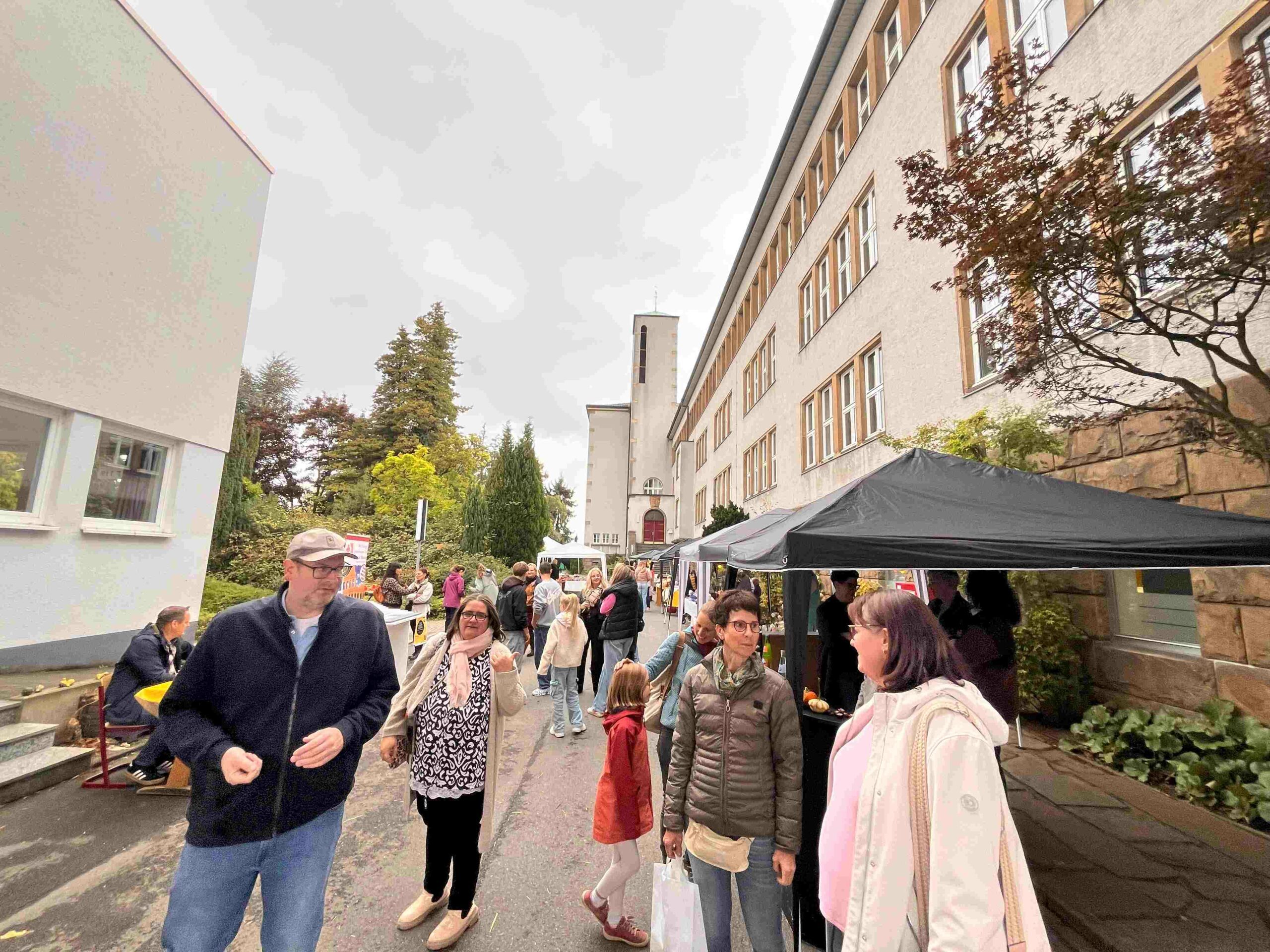 Am Samstag, dem 27. September 2025, fand auf dem Gelände der Walburgisschulen eine Veranstaltung der besonderen Art statt: der von der Elternschaft organisierte Herbstmarkt. Dabei präsentierte sich das Gelände in stimmungsvoller Dekoration: Heuballen, Kürbisse und Kastanien setzten farbenfrohe Akzente. Auf dem Lehrerparkplatz entstand mit einer Heuballenrunde und einer Feuerschale eine besonders gemütliche Ecke, die zum Stockbrotbacken einlud und den Kindern zusätzlich kleine Bewegungsangebote bot.