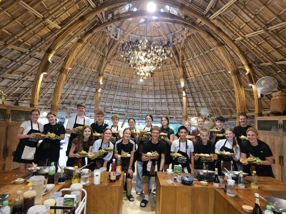 So erlebnisreich wie die erste Woche war, startete auch die zweite Woche unseres Aufenthalts. Nach einem Vormittag in der Schule ging es am Nachmittag gemeinsam zu einem thailändischen Kochkurs. Hier konnten die Schülerinnen und Schüler aus einer Vielzahl traditioneller Gerichte ihre vier Favoriten auswählen und diese selbstständig zubereiten. Neben Frühlingsrollen, Salaten, Reisgerichten und Currys stand auch das Kennenlernen und Probieren der verschiedenen Zutaten im Vordergrund. Besonders überraschend war, dass die Zugabe von Fischsoße – deren Geruch im unverarbeiteten Zustand eher an Hundefutter erinnert – den Geschmack der Gerichte deutlich verfeinerte und angenehm abrundete.