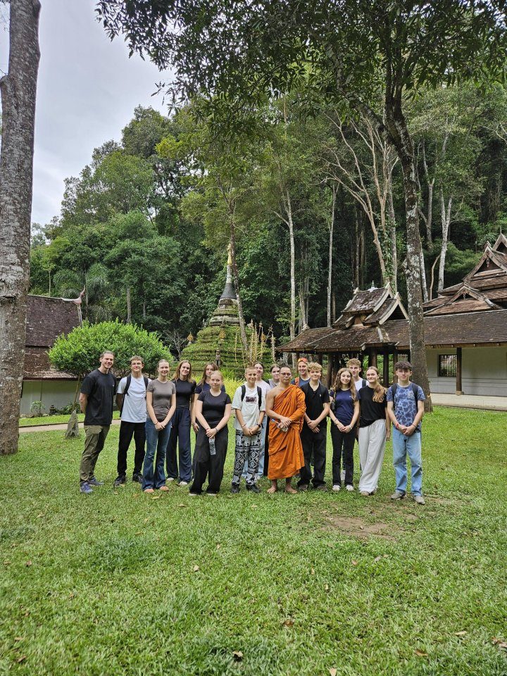 Der Freitag begann mit Unterricht, bevor wir am Nachmittag den sogenannten „Monk’s Trail“ zum Tempel Wat Pha Lat erwanderten. Der Weg führt durch den Regenwald hinauf zu einem idyllisch gelegenen Tempel mitten im Dschungel, umgeben von moosbewachsenen Pagoden und Statuen. Dort erhielten wir die besondere Gelegenheit, mit einem Mönch ins Gespräch zu kommen. Er gab uns Einblicke in seinen Glauben und das Leben im Tempel. Zum Abschied erhielt jede und jeder von uns ein Armband, das im Buddhismus als traditionelle Segnung gilt und den Träger vor Unglück, negativen Einflüssen und Krankheiten schützen soll.